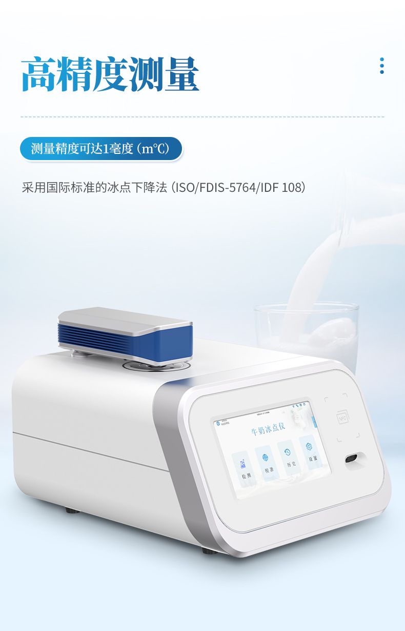 1 高精度測量:采用國際標(biāo)準(zhǔn)的冰點(diǎn)下降法(ISO/FDIS-5764/IDF 108),測量精度可達(dá)1毫度(m℃),適用于牛奶、羊奶、山羊奶、水牛奶和駱駝奶等各種類型的奶。