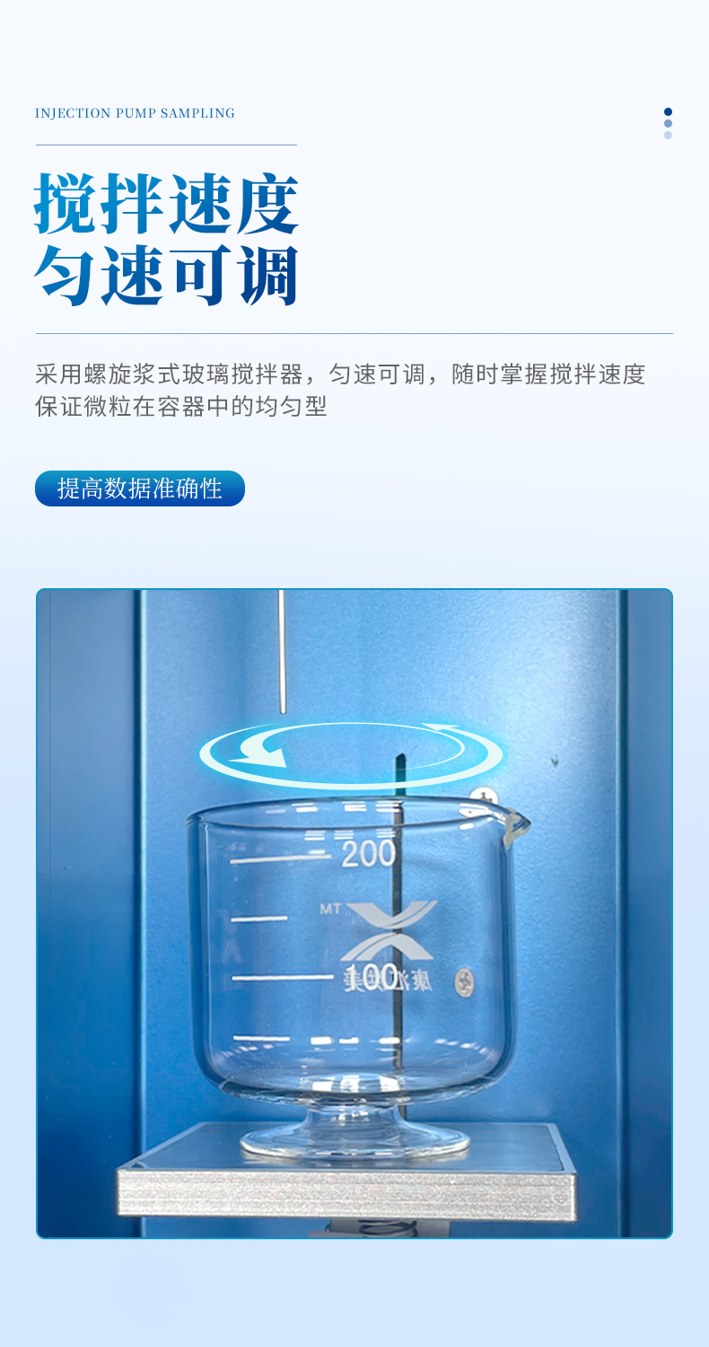 ●采用螺旋漿式玻璃攪拌器,勻速可調,隨時掌握攪拌速度,保證微粒在容器中的均勻型。提高數據準確性