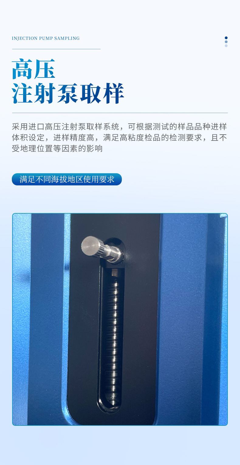 ●采用進(jìn)口高壓注射泵取樣系統(tǒng),可根據(jù)測(cè)試的樣品品種進(jìn)樣體積設(shè)定,進(jìn)樣精度高,滿足高粘度檢品的檢測(cè)要求,且不受地理位置等因素的影響,滿足不同海拔地區(qū)的使用要求。