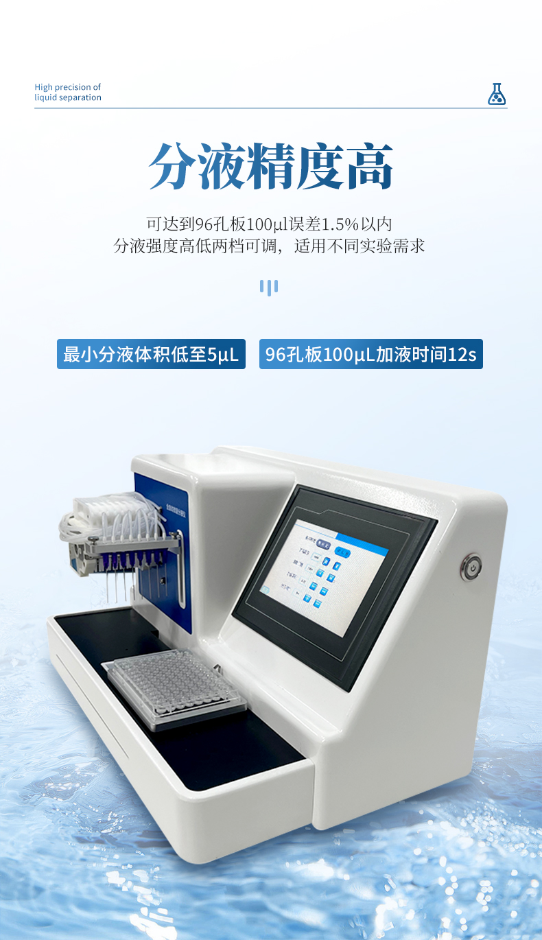 2、分液精度高,可達到96孔板100μl誤差1.5%以內,最小分液體積低至5μL,96孔板100μL加液時間12s。