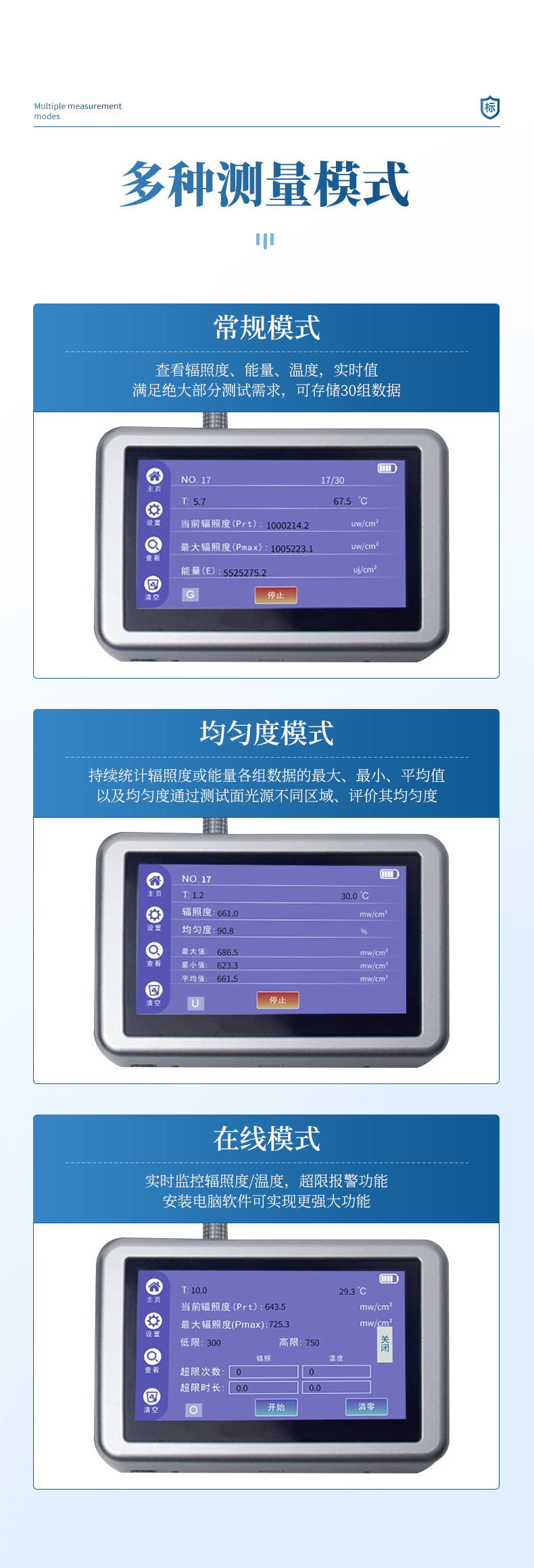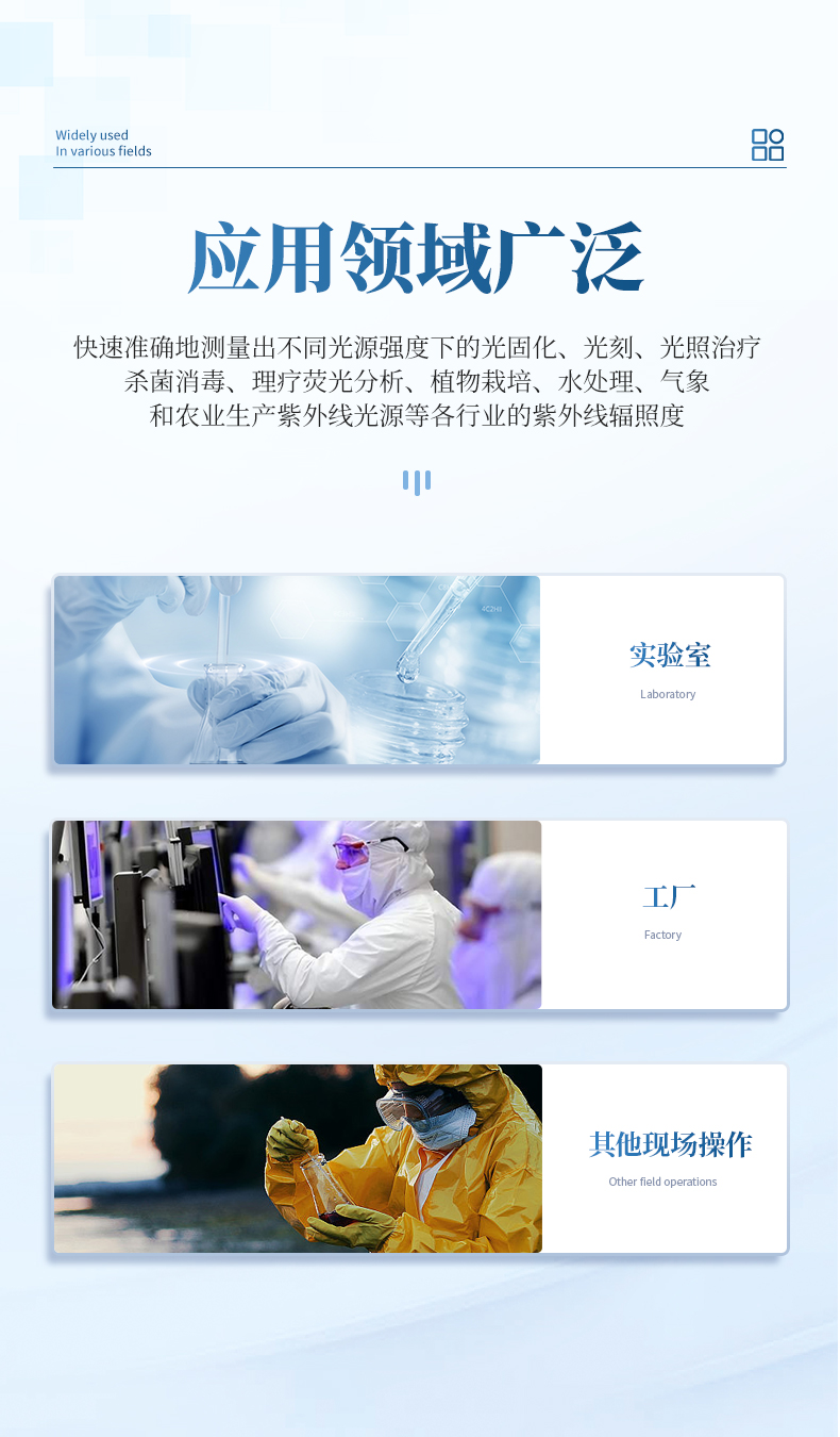 讀取,精度更高;測量模式可切換,可實時監(jiān)控;可通過測試面光源不同區(qū)域、評價其均勻度;量程可自動識別切換,真正實現(xiàn)從弱光到強光一機式測試,儀器操作更加簡單快捷。快速、準確地測量出不同光源強度下的光固化、光刻、光照治療、殺菌消毒、理療熒光分析、植物栽培、水處理、氣象和農(nóng)業(yè)生產(chǎn)紫外線光源等各行業(yè)的紫外線輻照度。