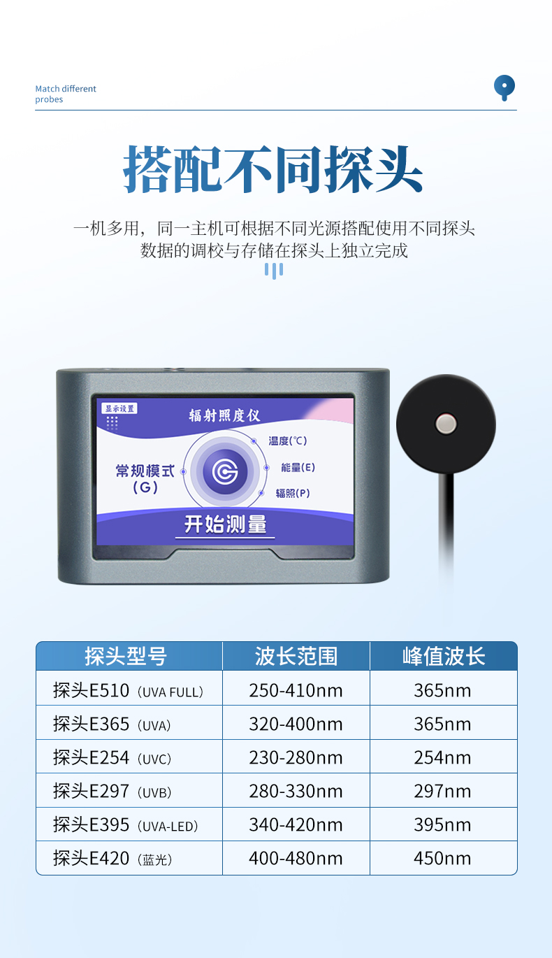 儀器分為主機和探頭兩部分,同一主機可根據(jù)不同使用需求搭配多款探頭,即插即用,滿足更多使用場景,可廣泛應用于實驗室、工廠或其他現(xiàn)場操作,幾乎可以在所有應用領域的質(zhì)量控制中實現(xiàn)準確的紫外線光強、能量測試。