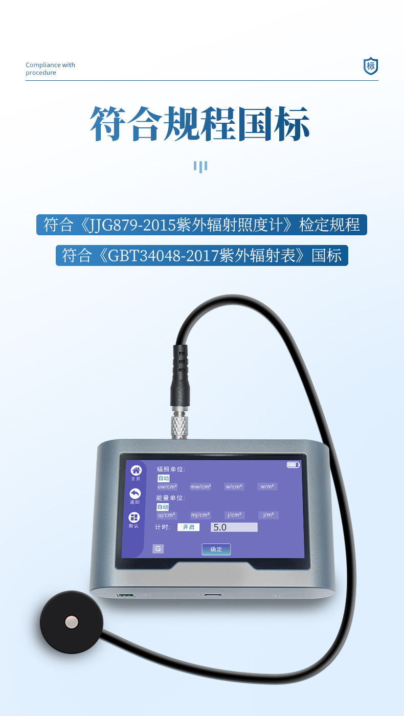 8.符合規(guī)程:《JJG879-2015紫外輻射照度計》檢定規(guī)程、《GBT34048-2017紫外輻射表》國標;