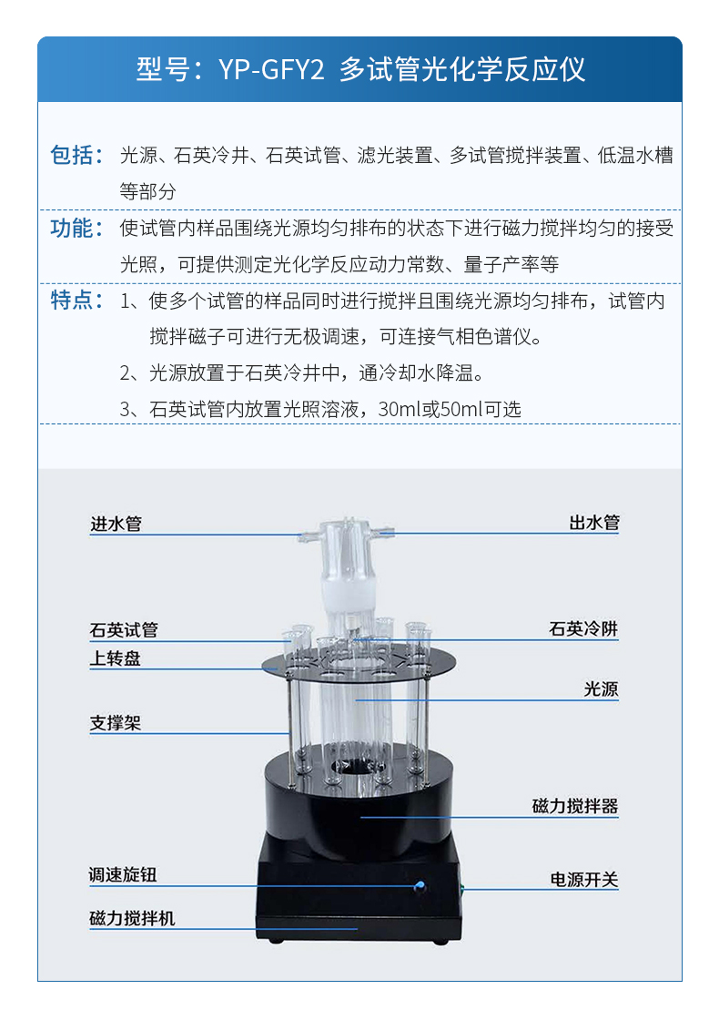 | 包括:光源、石英冷井、大容量反應容器、大容量磁力攪拌裝置、低溫水槽、冷凝管、磨口溫度計等部分。 功能:使大容量反應器內樣品圍繞光源均勻排布的狀態下進行磁力攪拌均勻的接受光照,可提供測定光化學反應動力和反應速率,提供分析反應產物和自由基的樣品等。 特點:1、使多個試管的樣品同時進行攪拌且圍繞光源均勻排布,試管內攪拌磁子可進行無極調速。 2、反應器附有石英冷井插口、冷凝管插口、溫度計插口、通氣插口 3、反應器規格250ml、500ml、1000ml三種規格可選。 4、光源放置于石英冷井中,通冷卻水降溫。 5、攪拌裝置加熱和不加型可選。 |