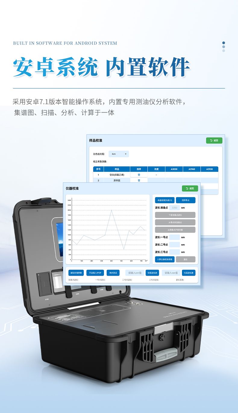 2.儀器采用安卓7.1版本智能操作系統,內置優云譜專用測油儀分析軟件,集譜圖、掃描、分析、計算于一體;