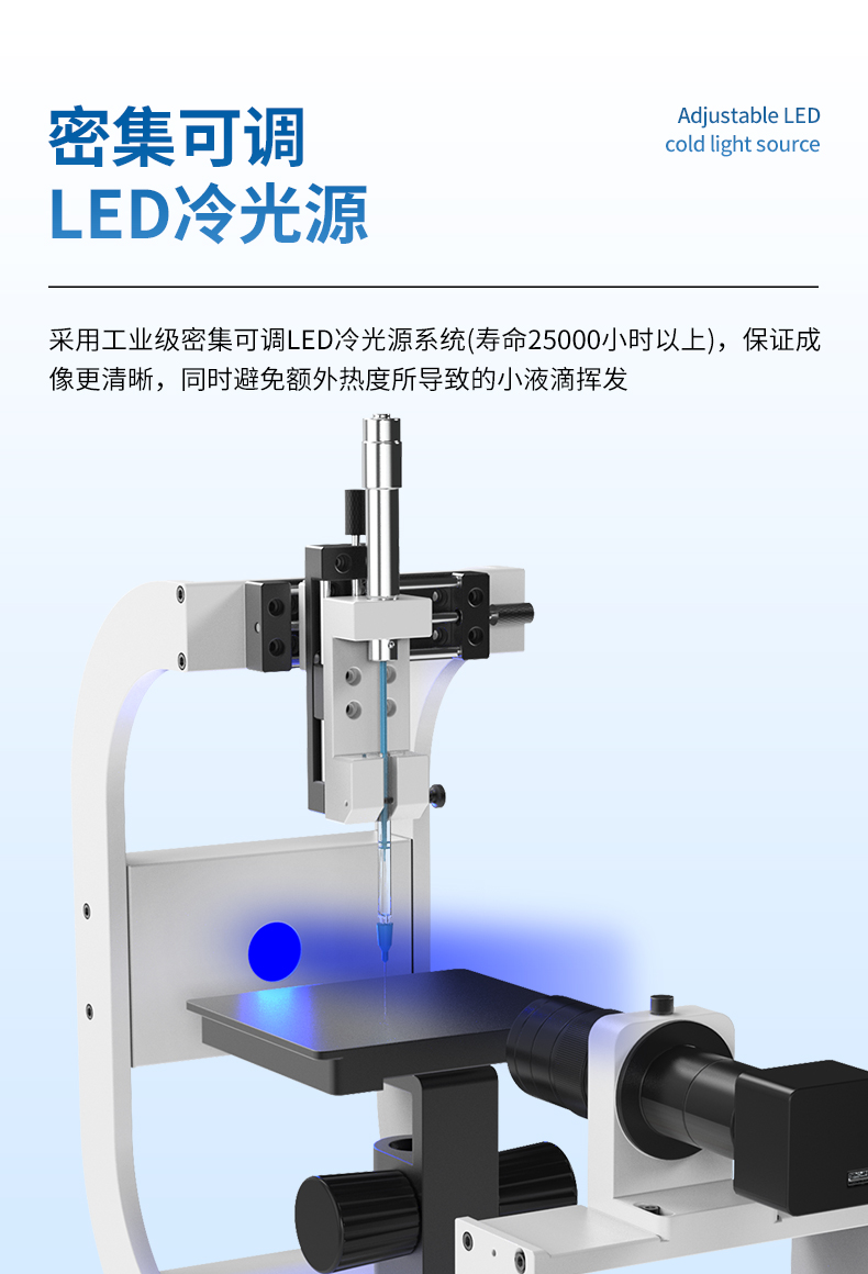 2. 采用工業(yè)級密集可調LED冷光源系統(tǒng)(壽命25000H以上),保證成像更清晰,同時避免額外熱度所導致的小液滴揮發(fā);