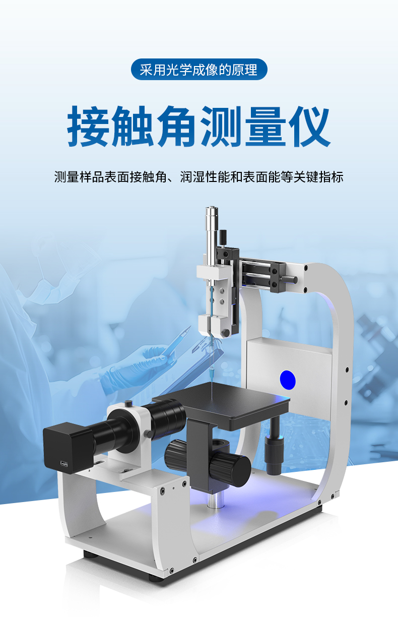 接觸角測量儀主要由光源、注射單元、采集系統、分析軟件四大部分組成,設備采用光學成像的原理。