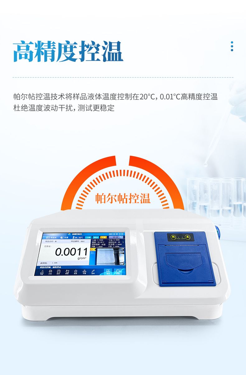 恒溫電子式液體密度計(jì)是通過結(jié)合帕爾帖控溫技術(shù)將樣品液體溫度控制在20℃,再由電磁引發(fā)U型管震蕩,通過震蕩頻率測(cè)算出樣品液體的密度。能夠測(cè)試大部分液體(高粘度以及氟化氫等會(huì)腐蝕玻璃的除外),正以實(shí)用、可靠、準(zhǔn)確率高、測(cè)量精度高等優(yōu)點(diǎn),廣泛應(yīng)用于飲料食品、石油化工、檢驗(yàn)檢疫、計(jì)量校準(zhǔn)等分析領(lǐng)域里。