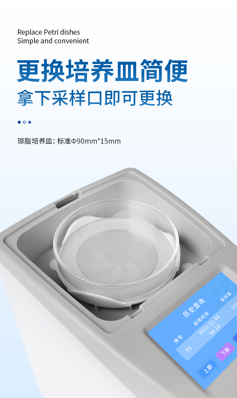 6、更換培養皿簡便,拿下采集口即可更換培養皿(使用標準通用培養皿直徑90*15);