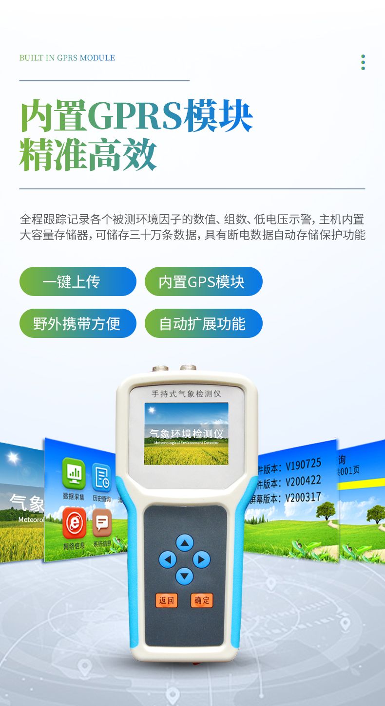 采用一體化結構設計,內置GPS模塊,GPRS模塊,外置SD卡,能準確的測量出被測地點的地理信息,界面除顯示所測環境參數、存儲數據外,還可顯示測點的經緯度。通過內置的GPRS一鍵上傳被測點的環境因子測量數據等。同時還可以通過外置SD卡直接把數據導出到電腦上。(可選)