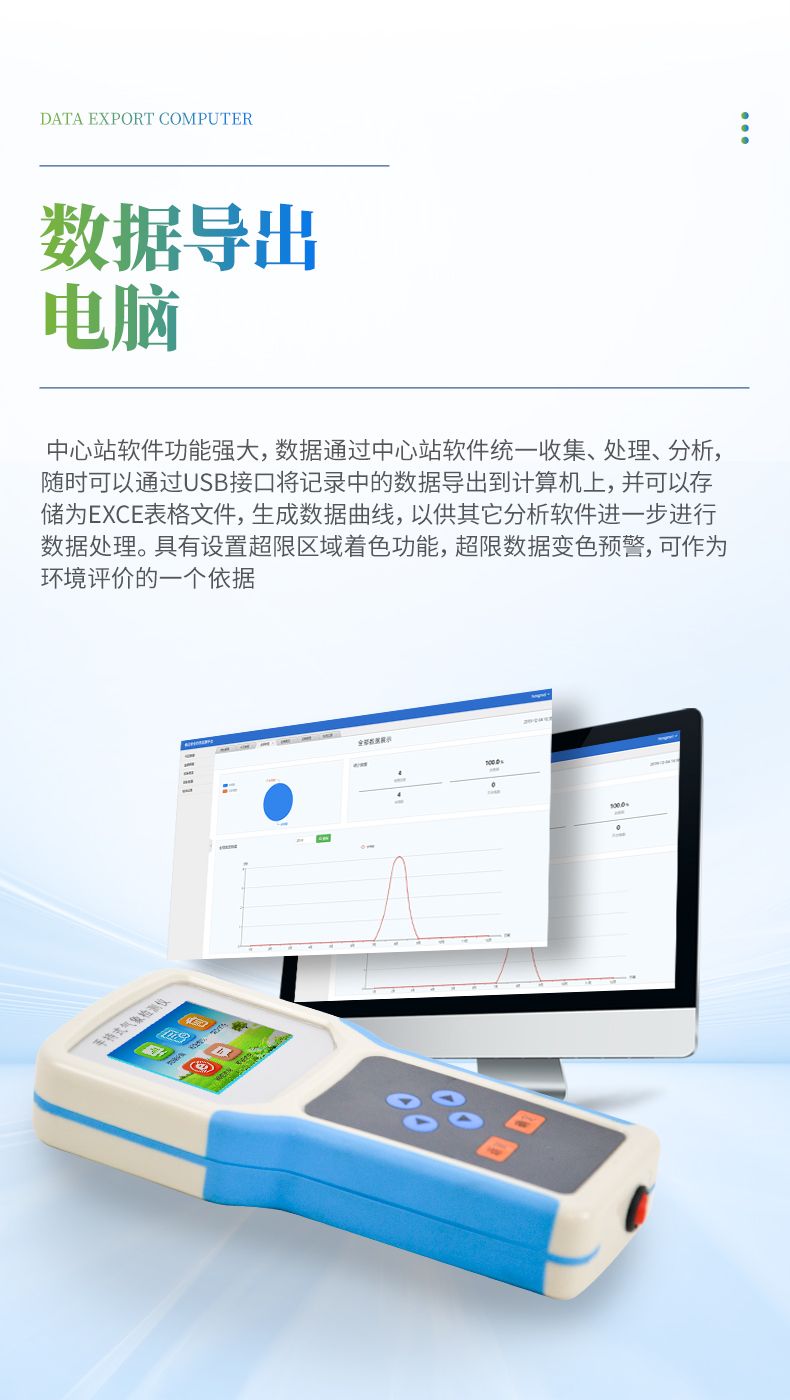 中心站軟件功能強大,數據通過中心站軟件統一收集、處理、分析,隨時可以通過USB接口將記錄中的數據導出到計算機上,并可以存儲為EXCE表格文件,生成數據曲線,以供其它分析軟件進一步進行數據處理。具有設置超限區域著色功能,超限數據變色預警,可作為環境評價的一個依據。