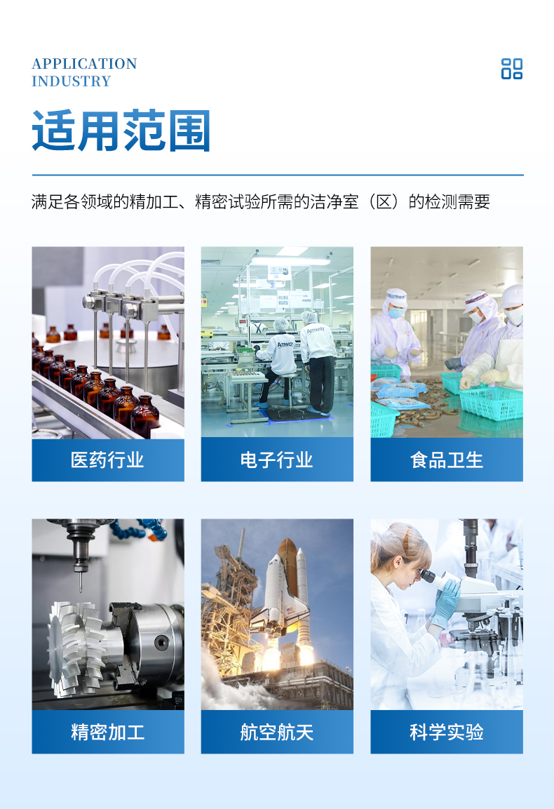 滿足醫藥行業(制藥廠、藥檢所、醫院等);電子行業(半導體工廠、精密機械的生產加工等);食品衛生行業(乳制品、塑封肉食品、調味食品、農產品等的精加工);過濾器的生產廠家(檢驗過濾器的質量及效率等);光學及航空航天等領域的精加工、精密試驗、生物工程等所需的潔凈室(區)的檢測需要。