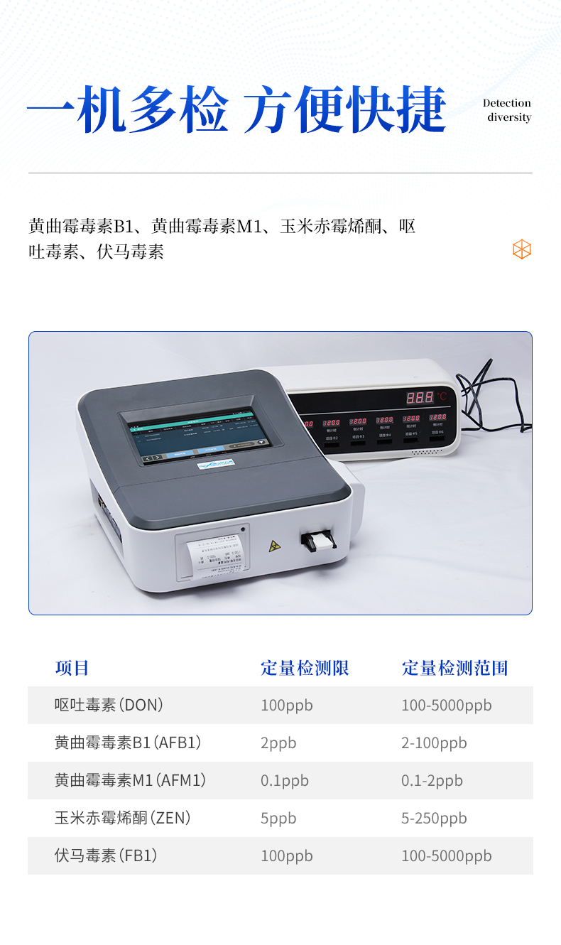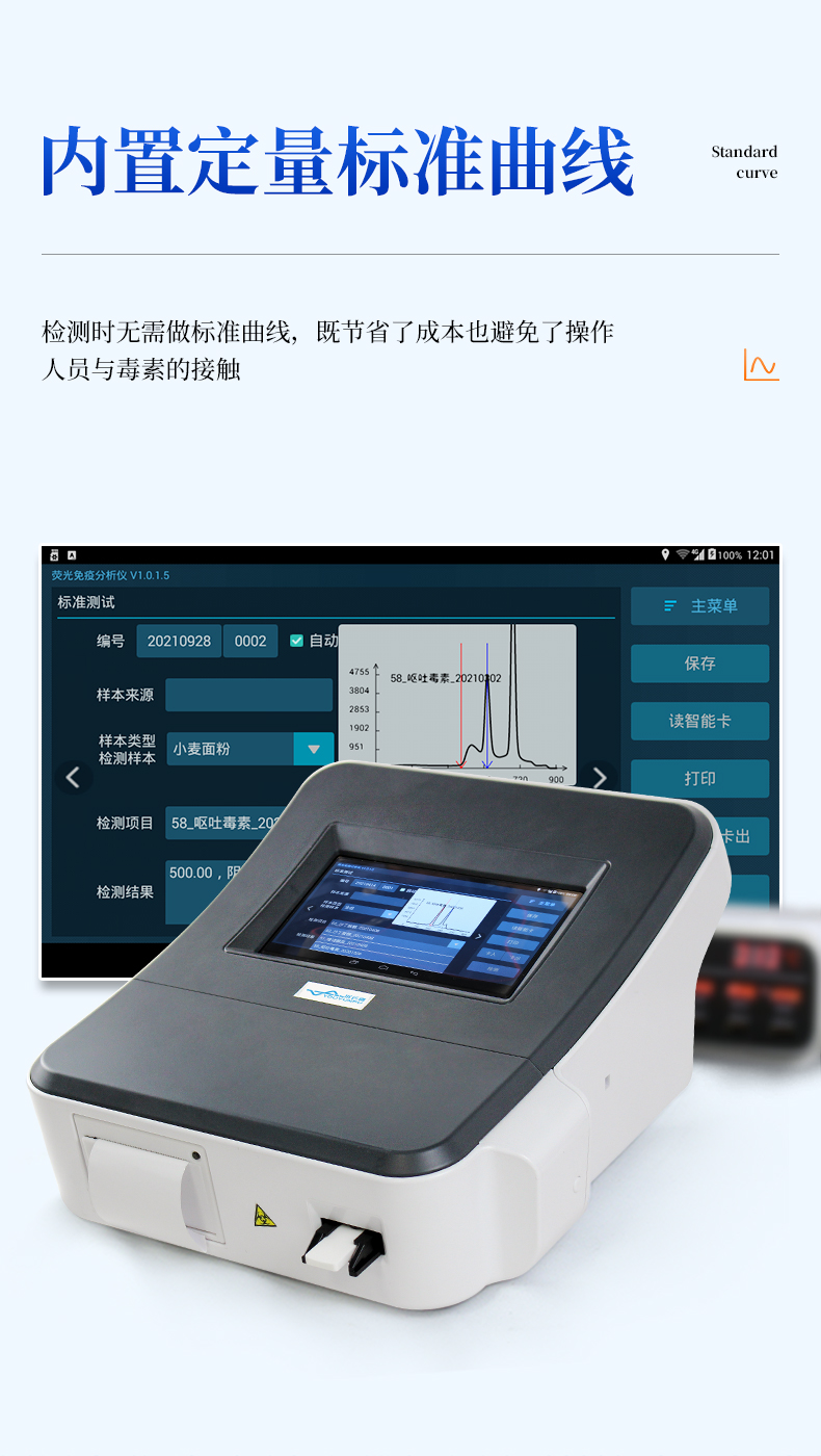 3、內(nèi)置定量標(biāo)準(zhǔn)曲線:儀器內(nèi)置標(biāo)準(zhǔn)曲線,無需使用標(biāo)準(zhǔn)品,檢測時(shí)無需做標(biāo)準(zhǔn)曲線,既節(jié)省了成本,也避免了操作人員與嘔吐毒素的接觸,保護(hù)操作人員的安全;