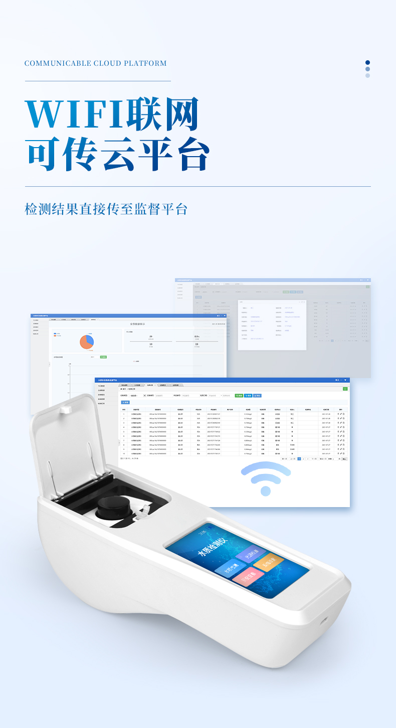 ②配置云監控平臺,檢測結果可直接無線傳至平臺,進行水質長短期分析,輔助管理。
