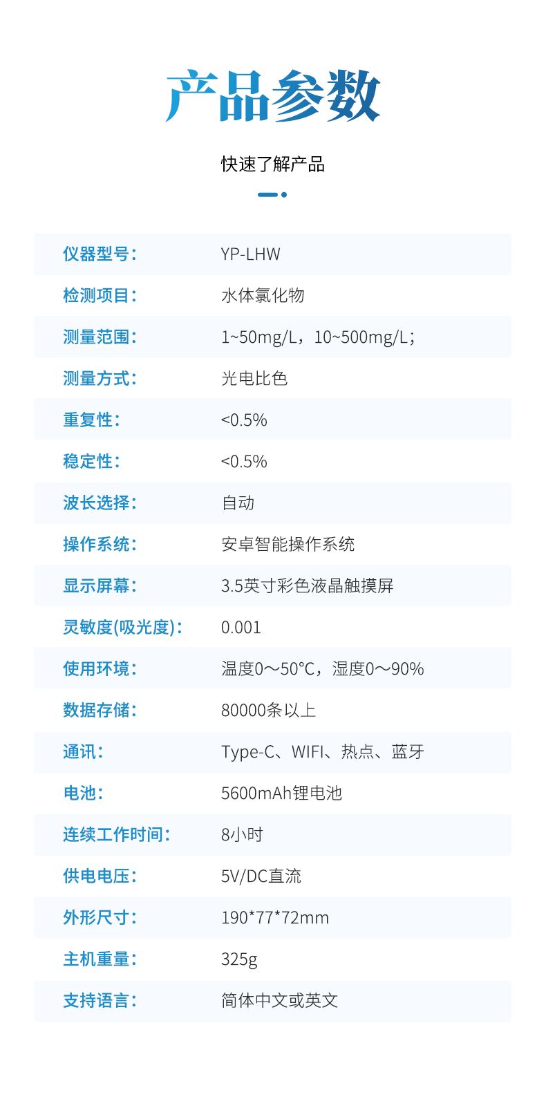 【產品簡介】檢測項目:氯化物 測量范圍: 1~500mg/L 波長范圍: 340~800nm