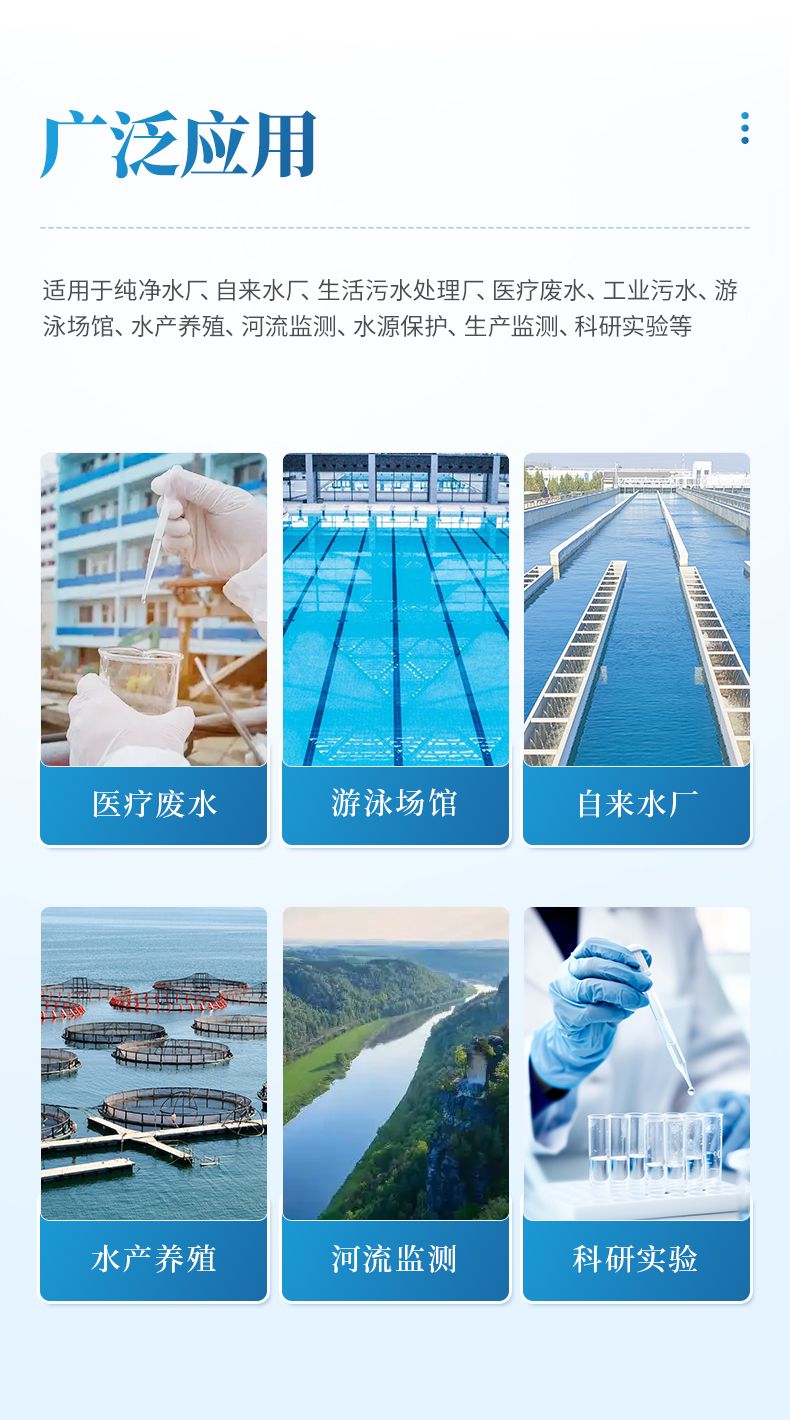 適用于純凈水廠、自來水廠、生活污水處理廠、醫療廢水、工業污水、游泳場館、水產養殖、河流監測、水源保護、生產監測、科研實驗等。