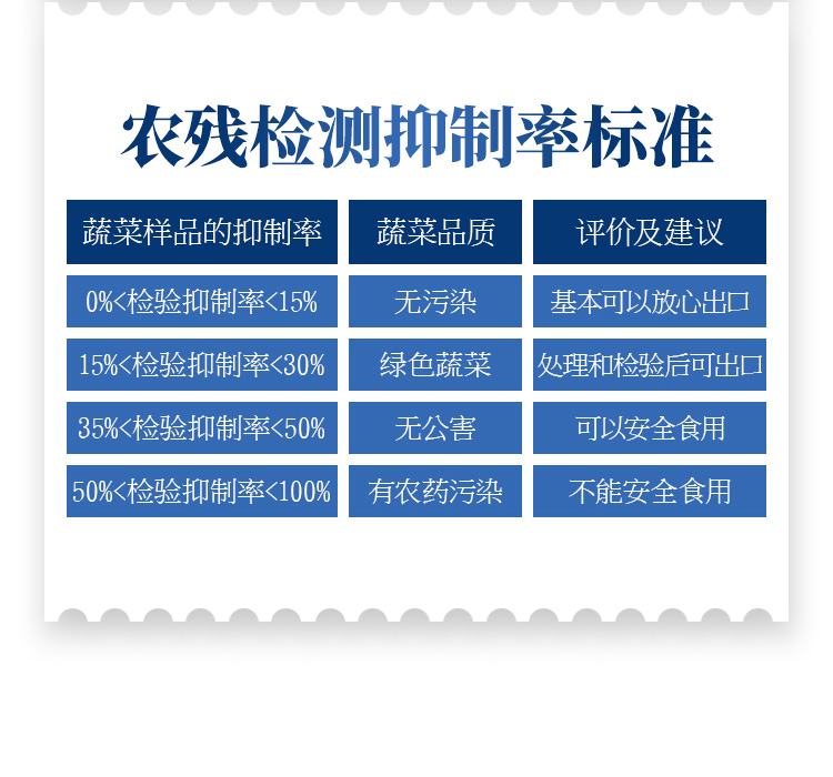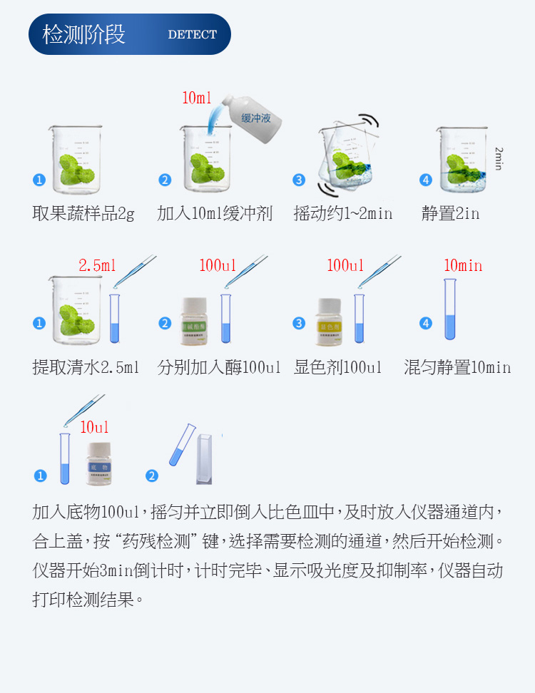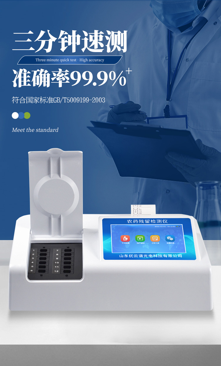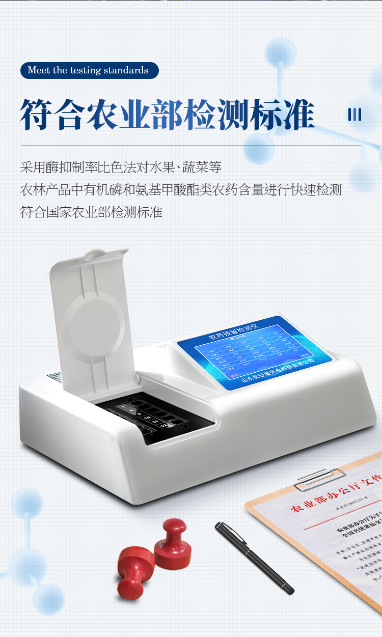檢測標(biāo)準(zhǔn):依據(jù)國家標(biāo)準(zhǔn)方法(GB/T5009.199-2003)以及世界衛(wèi)生組織WHO、世界糧農(nóng)組織FAO殘留農(nóng)藥檢測標(biāo)準(zhǔn)、世界環(huán)境保護(hù)局EPA參照攝入量等要求來設(shè)計(jì)。采用酶抑制率比色法對水果、蔬菜等農(nóng)林產(chǎn)品中有機(jī)磷和氨基甲酸酯類農(nóng)藥含量進(jìn)行快速準(zhǔn)確的檢測。