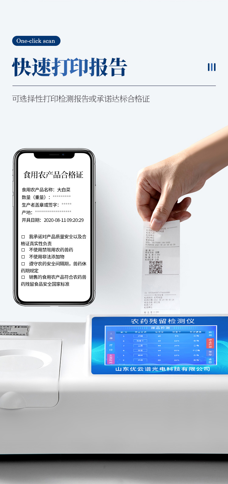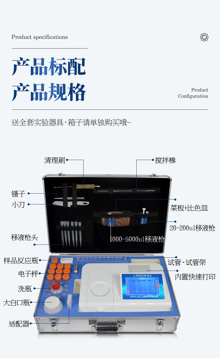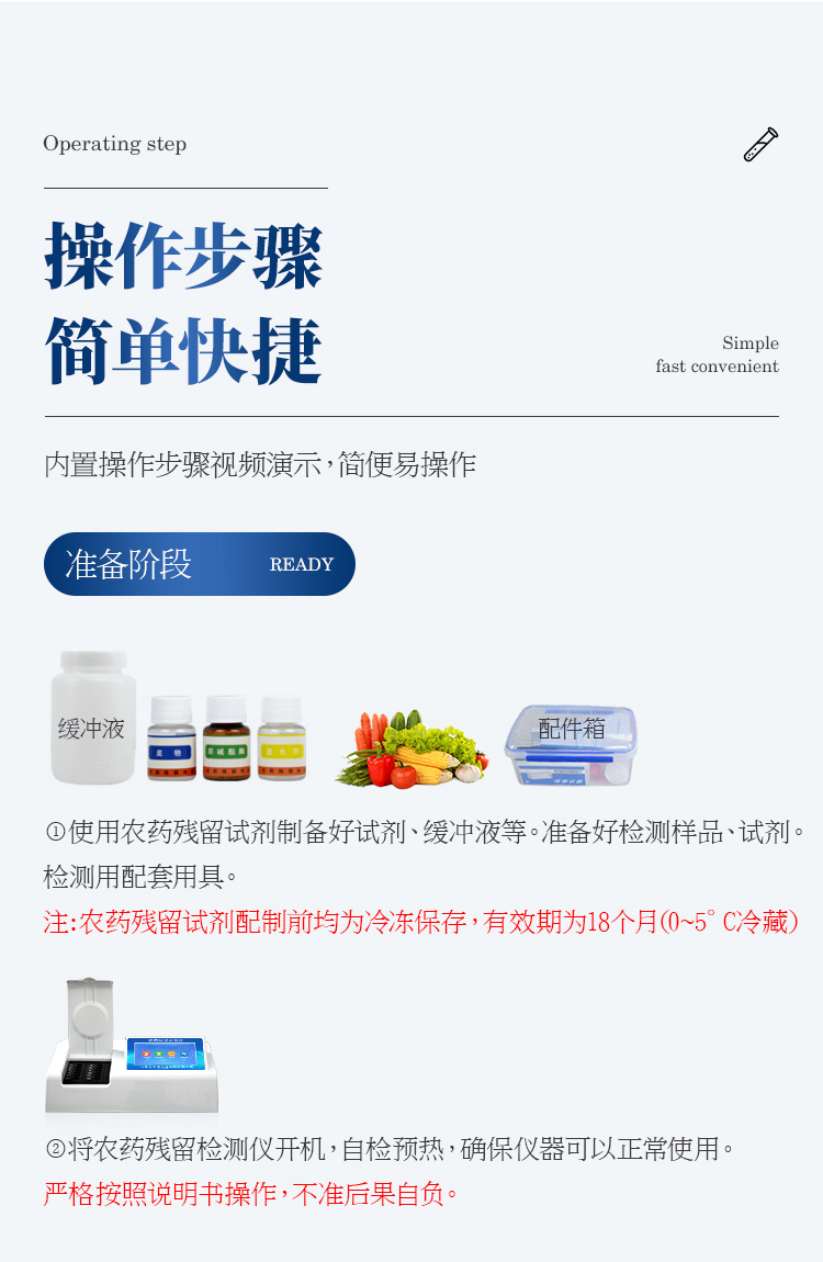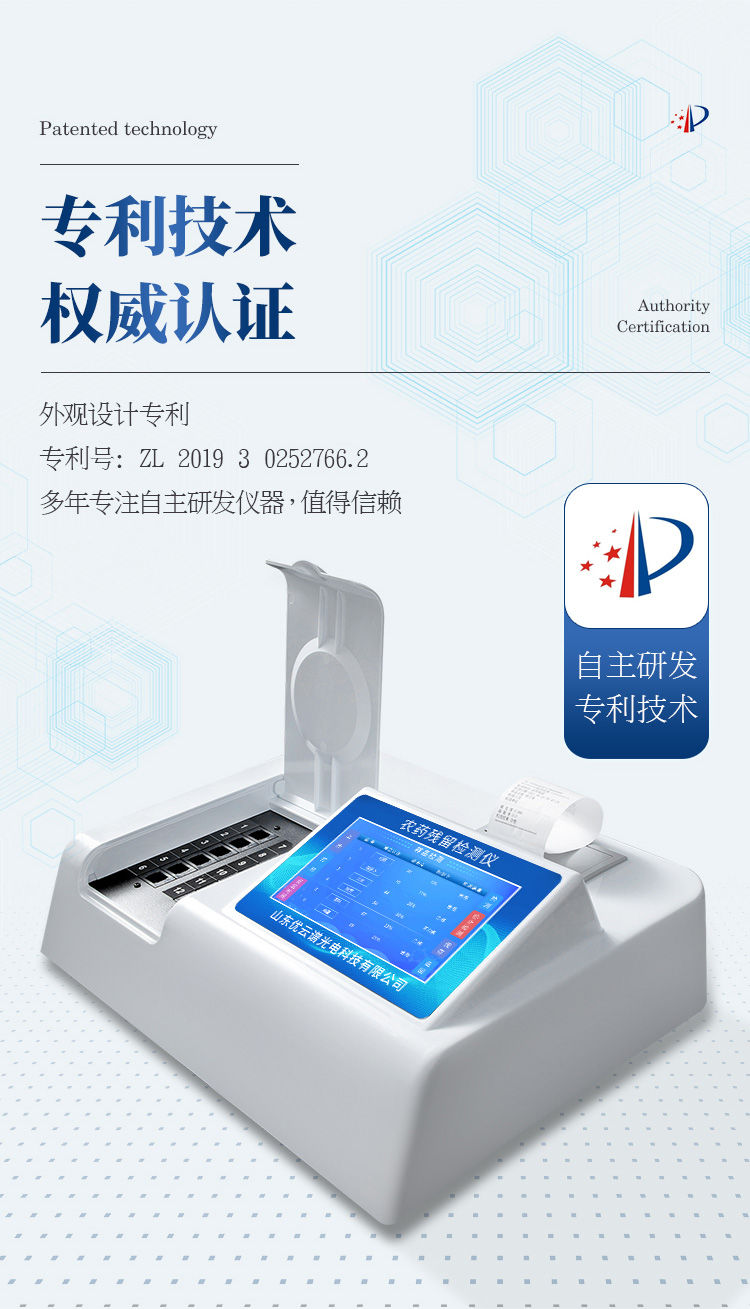 檢測標(biāo)準(zhǔn):依據(jù)國家標(biāo)準(zhǔn)方法(GB/T5009.199-2003)以及世界衛(wèi)生組織WHO、世界糧農(nóng)組織FAO殘留農(nóng)藥檢測標(biāo)準(zhǔn)、世界環(huán)境保護(hù)局EPA參照攝入量等要求來設(shè)計(jì)。采用酶抑制率比色法對水果、蔬菜等農(nóng)林產(chǎn)品中有機(jī)磷和氨基甲酸酯類農(nóng)藥含量進(jìn)行快速準(zhǔn)確的檢測。
