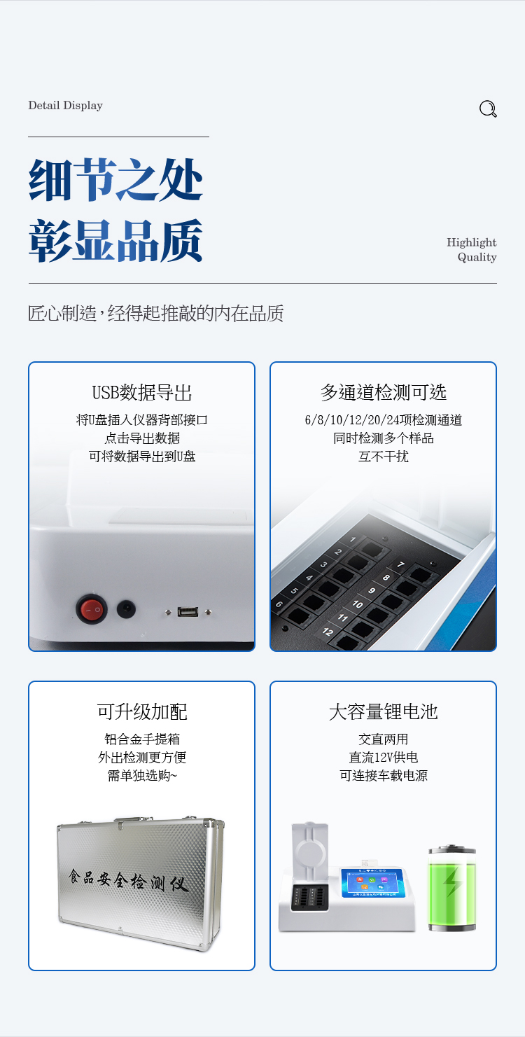 9、一體化便攜式快檢設備,滿足現場及流動檢測使用需求,能夠在同一軟件下實現所有檢測項目的檢測,并可通過同一窗口直觀顯示檢測結果。