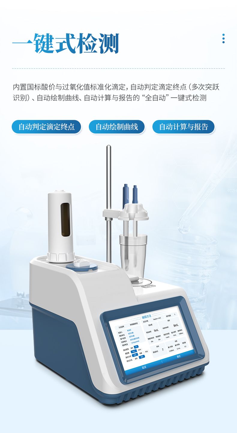 3.內(nèi)置國標(biāo)酸價與過氧化值標(biāo)準(zhǔn)化滴定,自動判定滴定終點(多次突躍識別)、自動繪制曲線、自動計算與報告的“全自動”一鍵式檢測;