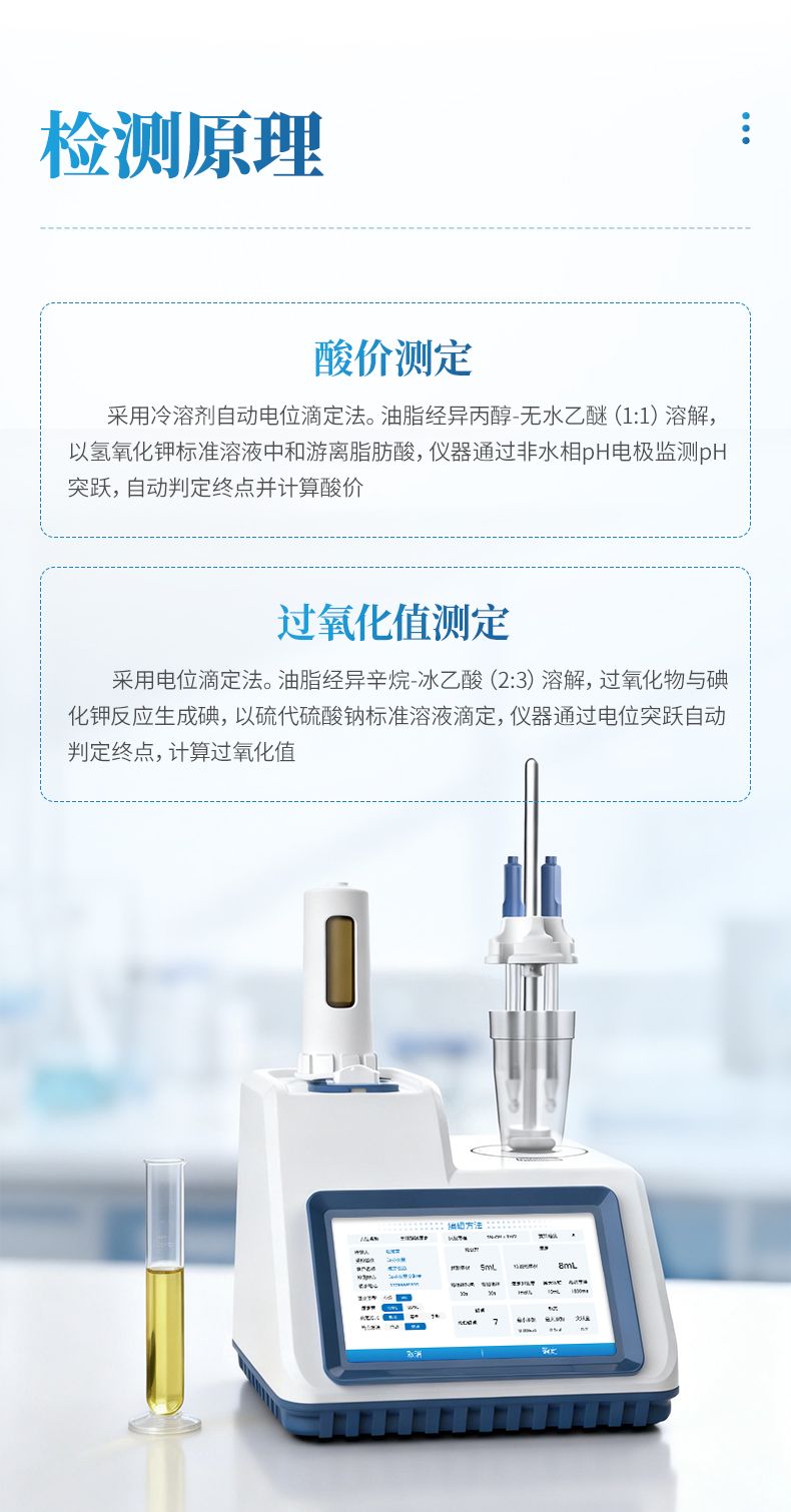 過氧化值測定:采用電位滴定法。油脂經(jīng)異辛烷-冰乙酸(2:3)溶解,過氧化物與碘化鉀反應(yīng)生成碘,以硫代硫酸鈉標(biāo)準(zhǔn)溶液滴定,儀器通過電位突躍自動判定終點,計算過氧化值。