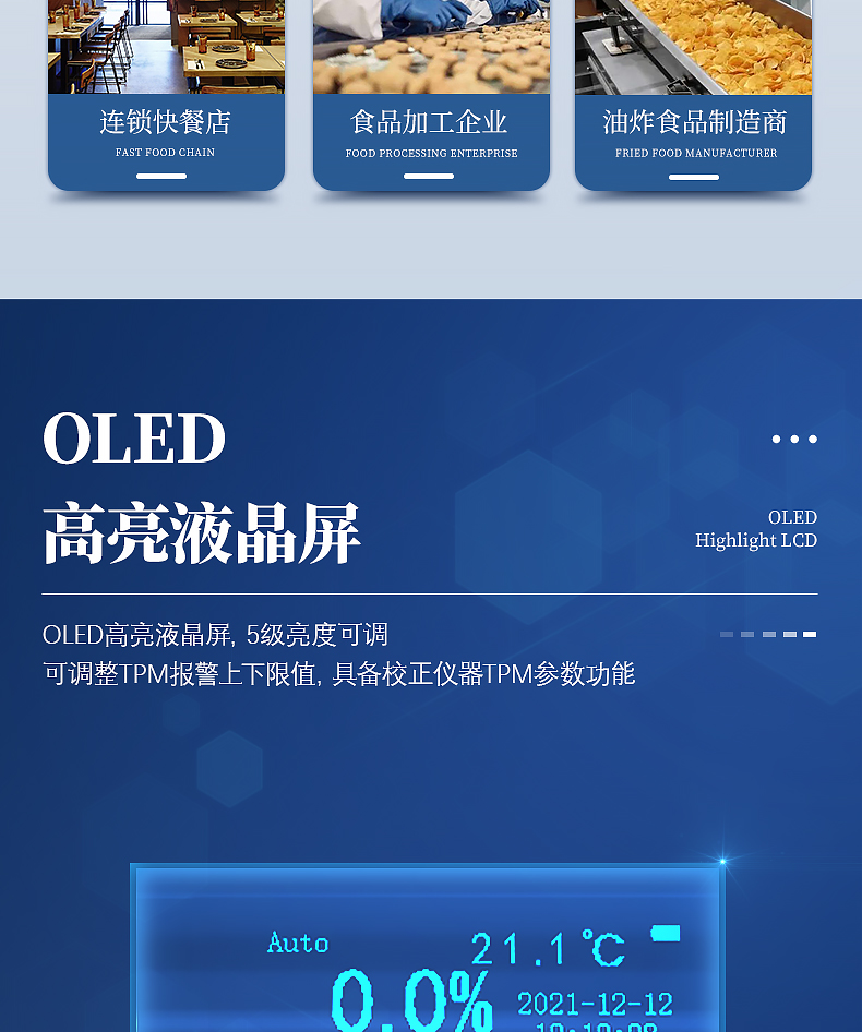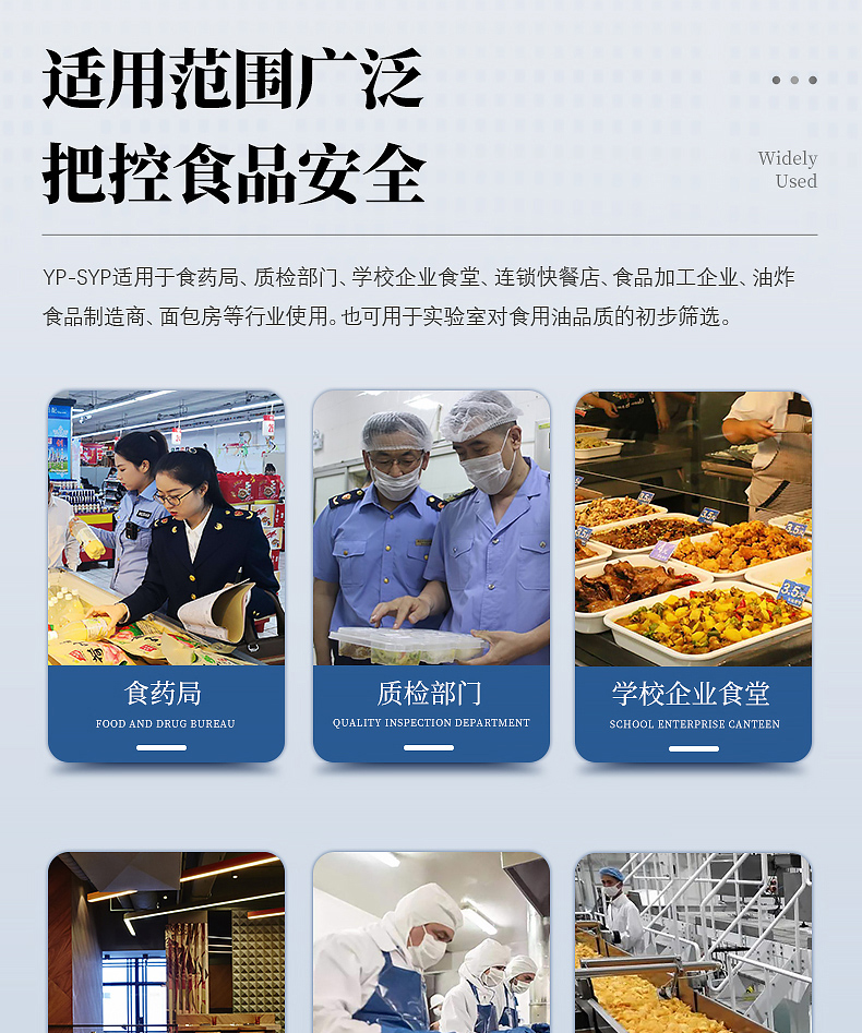 YP-SYP工業版特別適合食藥局、質檢部門、學校企業食堂、連鎖快餐店、食品加工企業、油炸食品制造商、面包房等行業使用,也可以用于實驗室對食用油品質的初步篩選,對劣質油、地溝油的鑒別等。能為您達到檢驗油品品質、節省食用油、保證產品的質量、保證食品安全的目的。