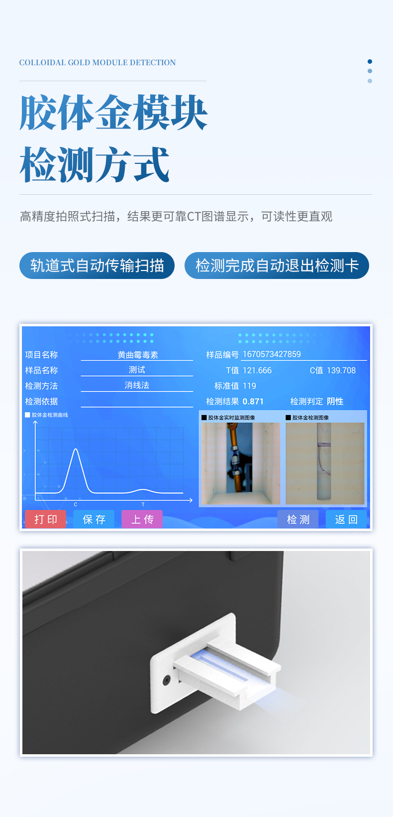 7、膠體金模塊檢測(cè)方式:軌道式自動(dòng)傳輸掃描,檢測(cè)完成后自動(dòng)退出檢測(cè)卡。