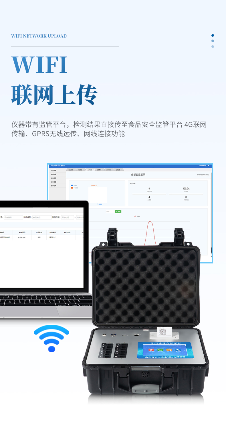 ★4、儀器帶有監管平臺,數據可局域網和互聯網數據上傳,檢測結果直接傳至食品安全監管平臺。進行區域食品安全監管及大數據分析處理與數據統計,檢測區域食品安全長短期動態,達到食品安全問題預估、預警