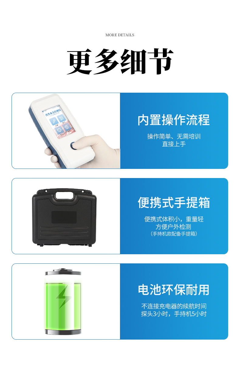 4. 不連接充電器的續(xù)航時間:探頭3小時,手持機(jī)5小時。