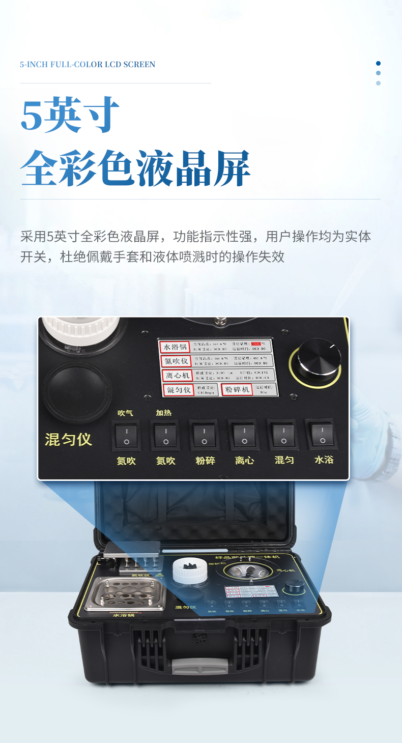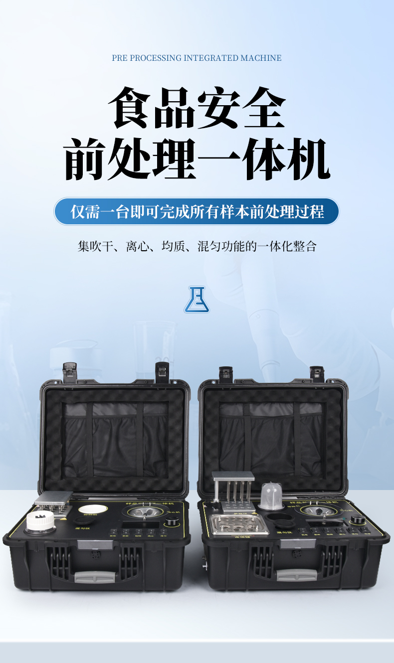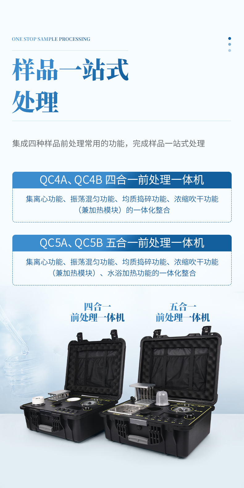 應國內用戶的實際需求,自行研制開發的新型儀器——QC05型樣品前處理一體機。樣品前處理集成箱將樣本前處理過程中樣品濃縮、水浴恒溫、離心分層、均質、振蕩混勻等步驟所需設備進行集成,僅需一臺樣品前處理集成箱設備即可完成所有樣本前處理過程,并且方便攜帶,不僅適用于現場檢測使用,還可用于色譜、質譜等分析樣品的純化和制備。