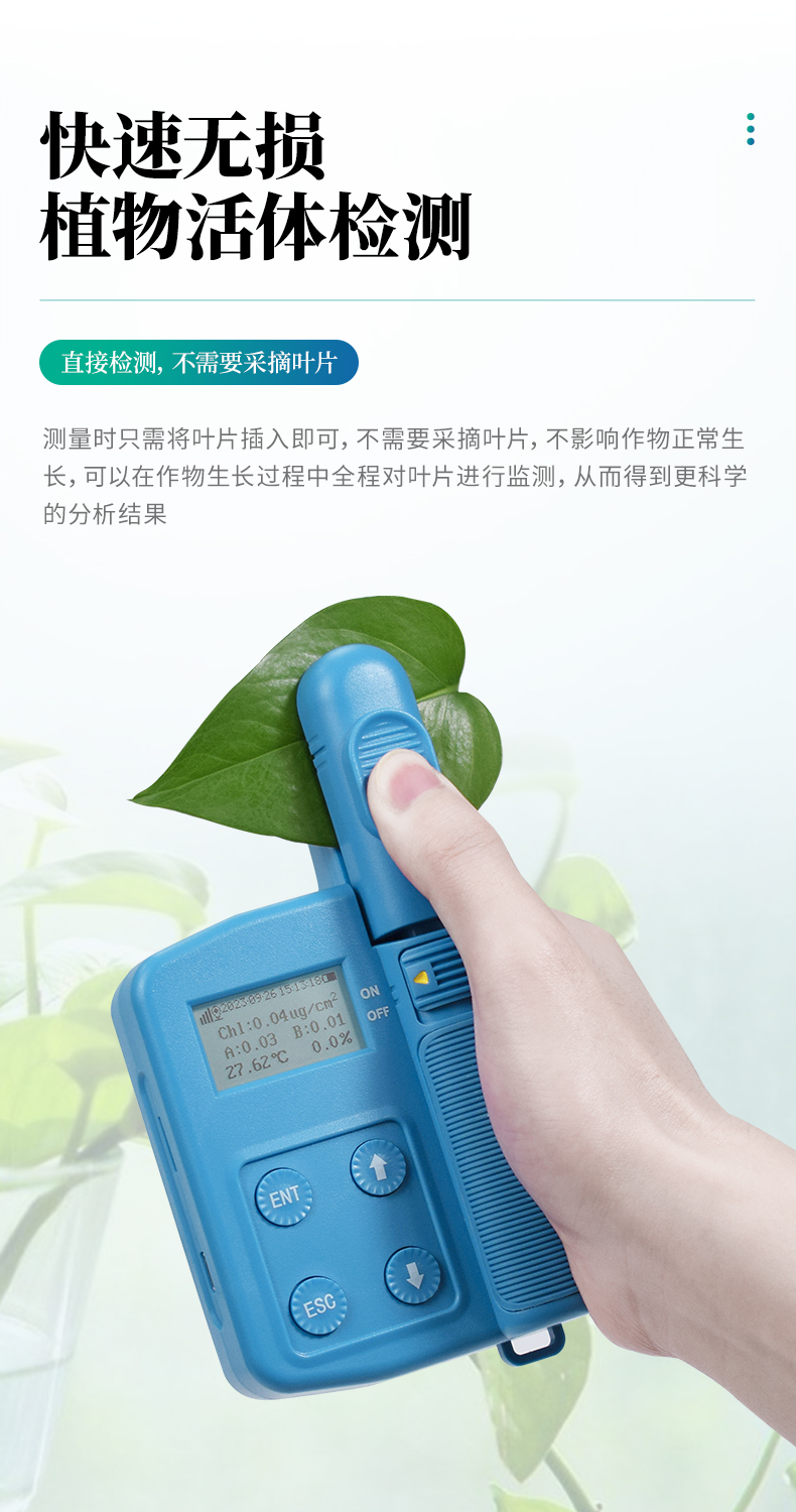 1.快速無(wú)損植物活體檢測(cè),測(cè)量時(shí)只需將葉片插入即可,不需要采摘葉片,不影響作物正常生長(zhǎng),可以在作物生長(zhǎng)過(guò)程中全程對(duì)葉片進(jìn)行監(jiān)測(cè),從而得到更科學(xué)的分析結(jié)果