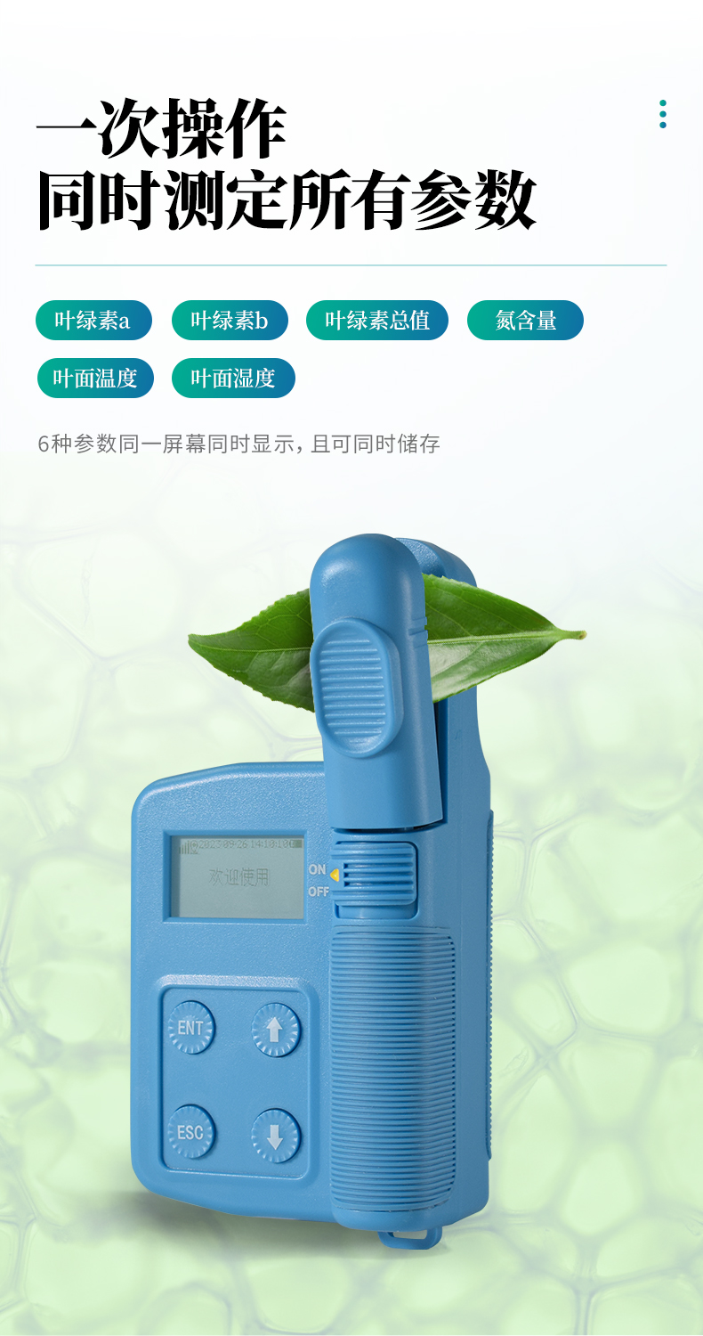 【產(chǎn)品簡(jiǎn)介】一次操作可同時(shí)測(cè)定所有參數(shù),葉綠素a、葉綠素b、葉綠素總值、氮含量、葉面溫度、葉面濕度6種參數(shù)同一屏幕同時(shí)顯示,可同時(shí)儲(chǔ)存