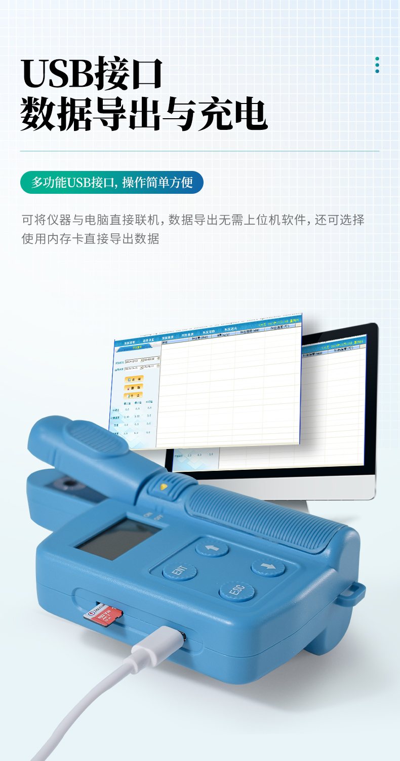 5.多功能USB接口,可實(shí)現(xiàn)數(shù)據(jù)導(dǎo)出與充電功能,可將儀器與電腦直接聯(lián)機(jī),數(shù)據(jù)導(dǎo)出無(wú)需上位機(jī)軟件,還可選擇使用內(nèi)存卡直接導(dǎo)出數(shù)據(jù),操作簡(jiǎn)單方便
