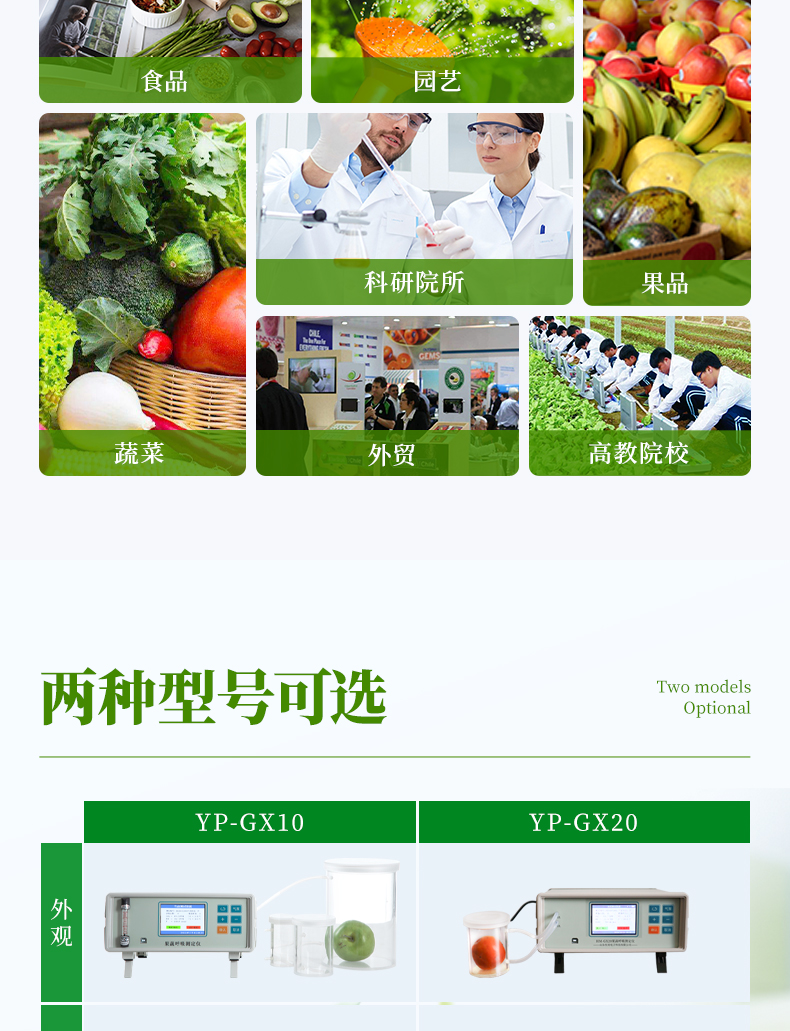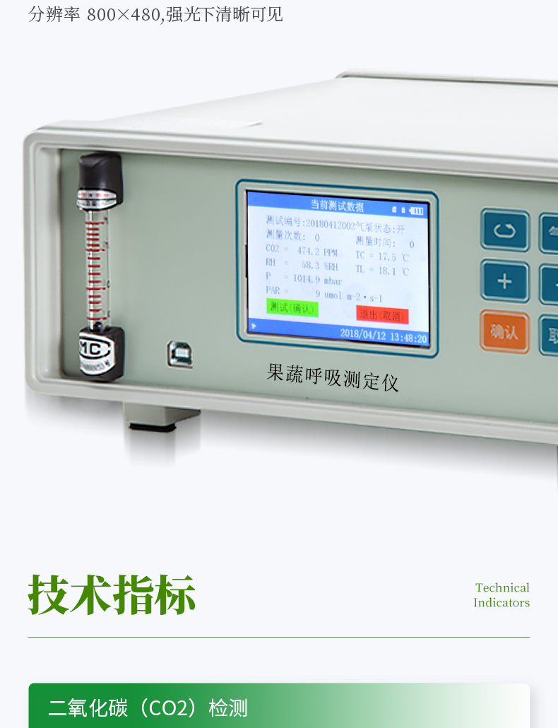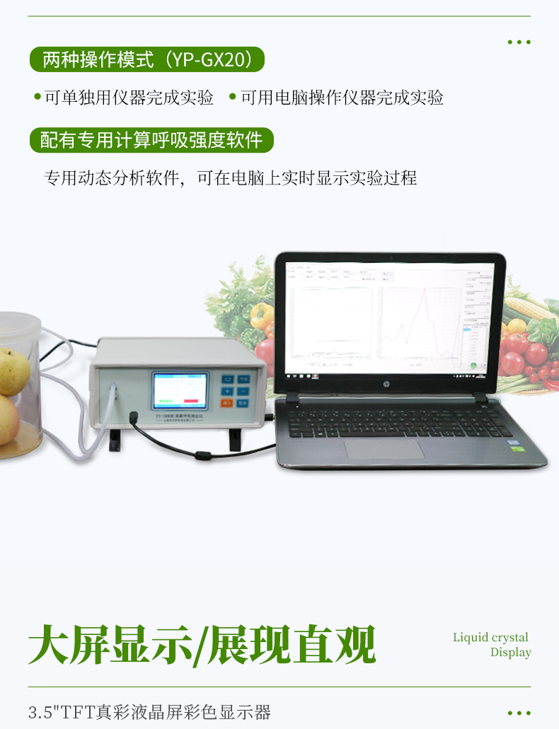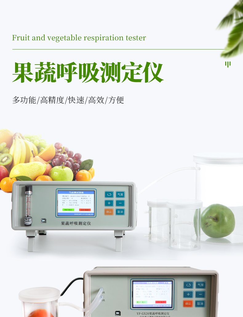 YP-GX20新型果蔬呼吸儀采用雙波長紅外二氧化碳分析器,3.5寸TFT 真彩液晶顯示器,專門用于常溫、冷藏庫、氣調庫、超市冷柜等儲藏條件下的果品和蔬菜呼吸強度的測定和分析研究。該儀器的特點是可以根據果蔬的大小來選擇不同體積的呼吸室,加快了平衡和測定時間;可以通過電腦直接操作儀器,同時顯示呼吸室的CO2濃度、O2濃度、溫度和濕度及變化曲線。
