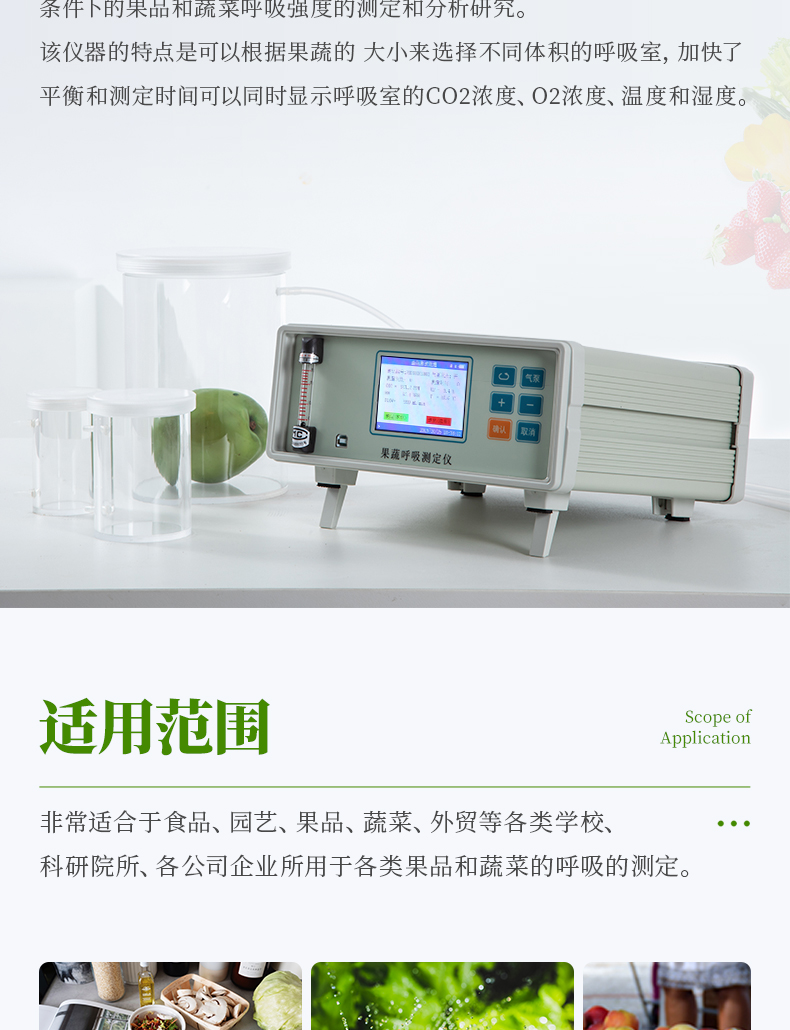 收獲后的果蔬產品仍然是一個獨立的有生命活動的生物體, 為了維持生命, 必然要進行呼吸作用。呼吸作用是果蔬等園藝產品采摘后最主要的生理代謝方式,呼吸強度是衡量呼吸作用強弱的一個指標, 是研究果蔬采摘后生理變化和貯運保鮮中必須掌握的重要指標。
