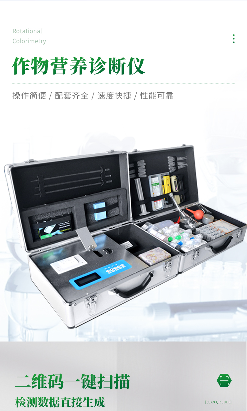 配套齊全:該儀器集藥、器、儀為一體,攜帶方便,相當于一個小型實驗室。適于農業服務部門或農資經銷商、肥料廠商、莊家醫院進行農化服務。