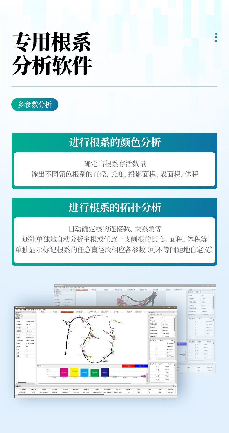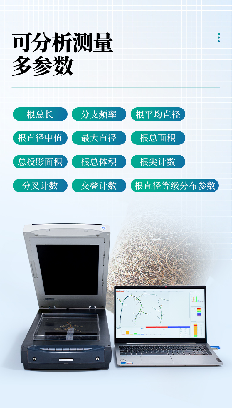根系分析系統用于洗根后專業根系分析,還可以用于根盒培養植物的根系表型分析,可以分析根系長度、直徑、面積、體積、根尖記數等,功能強大,操作簡單,軟件可分析植物根系的形態分析及根系的整體結構分布等,廣泛運用于根系形態和構造研究。