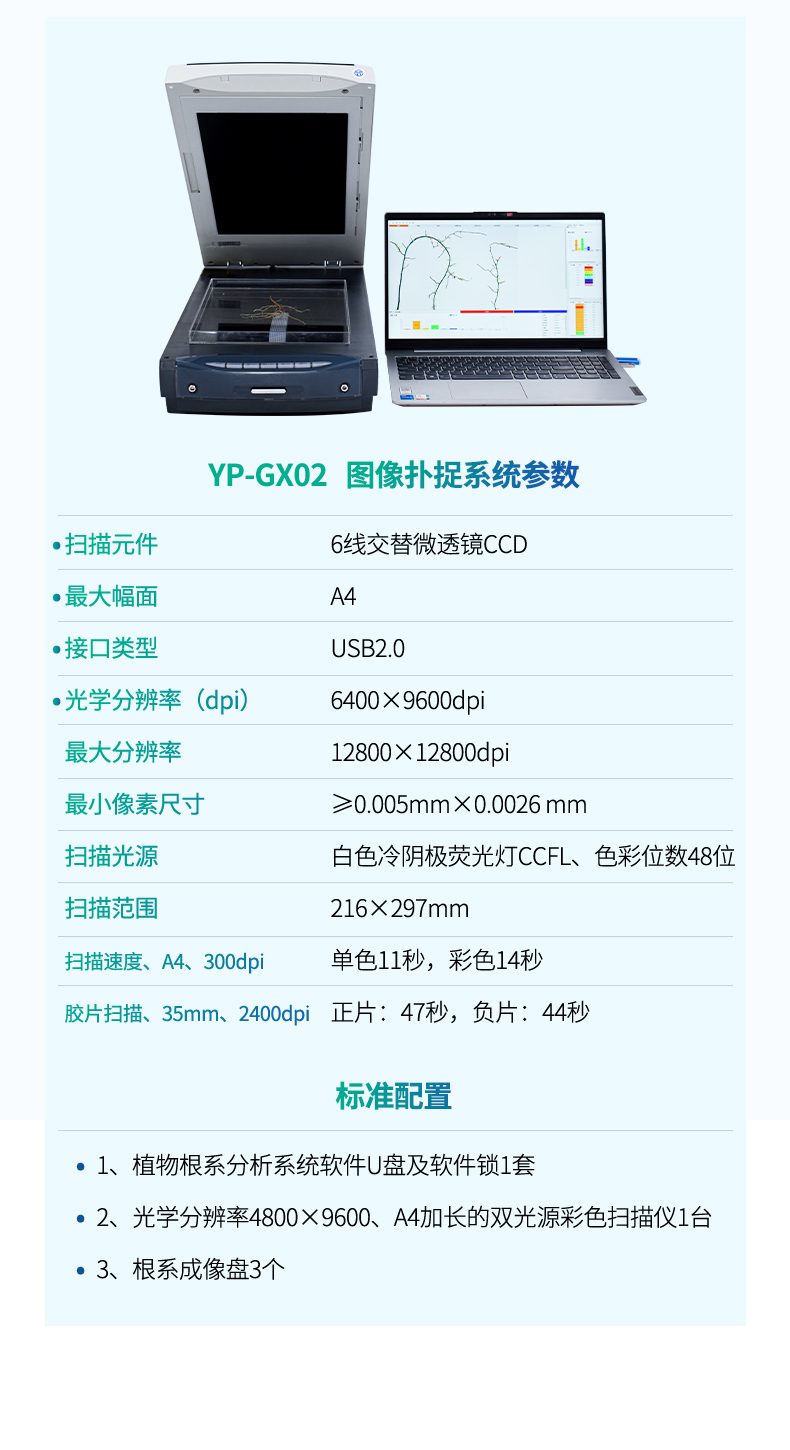 1、配光學分辨率4800×9600、A4加長的雙光源彩色掃描儀。根系反射稿幅面為355.6mm×215.9mm,透掃幅面為320.0mm×203.2mm,最小像素尺寸0.005mm×0.0026 mm。