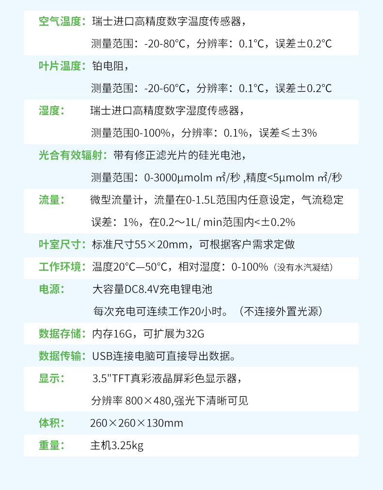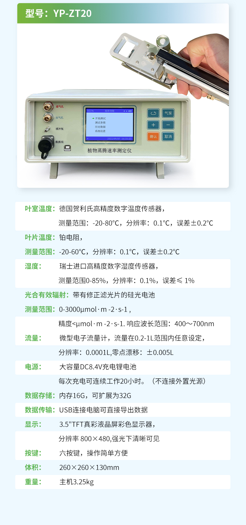 植物蒸騰速率是指水分通過植物體內時,經過植物體表(主要是葉片)以氣體的方式散發到大氣中的速度。植物的蒸騰作用能產生的蒸騰拉力,蒸騰拉力是植物被動吸水與轉運水分的主要動力,這對高大的喬木尤為重要;蒸騰作用可以促進木質部汁液中物質的運輸,土壤中的礦質鹽類和根系合成的物質可隨著水分的吸收和集流而被運輸和分布到植物體各部分去;蒸騰作用還可以降低植物體的溫度,防止葉片被灼傷,這是因為水的氣化熱高,在蒸騰過程中可以散失掉大量的輻射熱。蒸騰作用的正常進行有利于CO2的同化,這是因為葉片進行蒸騰作用時,氣孔是開放的,開放的氣孔便成為CO2進入葉片的通道。因此作物植物蒸騰速率測量儀對于農業科研、教學、園藝研究、林業研究等具有重大意義。