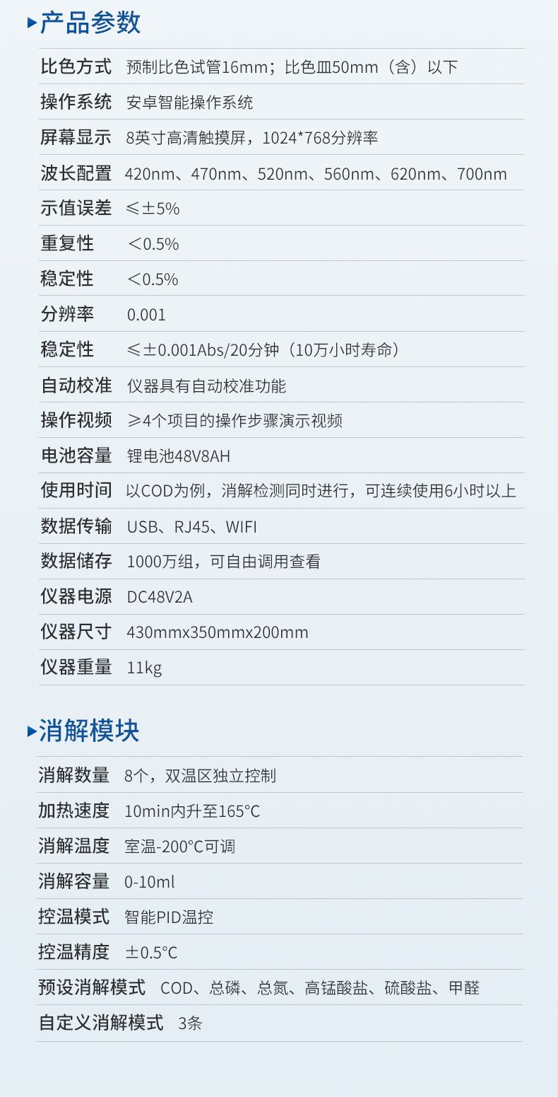 4、內(nèi)置雙溫區(qū)8孔消解儀,左右溫區(qū)獨(dú)立控制,可對(duì)COD總磷總氮等進(jìn)行快速消解。