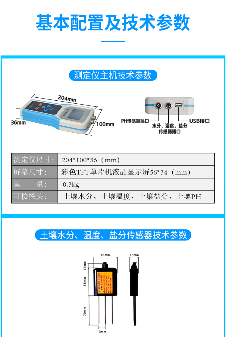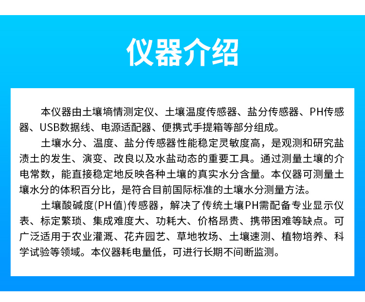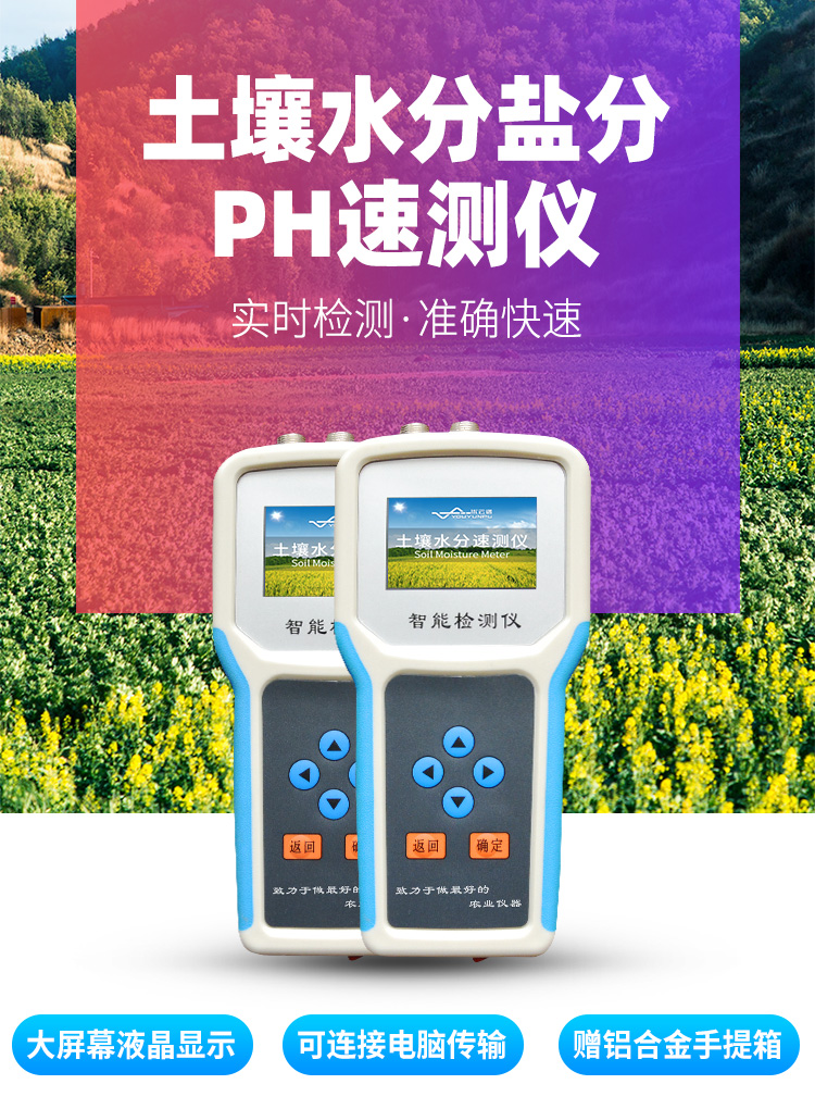 土壤水分溫度鹽分PH測(cè)定儀采用一體化結(jié)構(gòu)設(shè)計(jì),可快速準(zhǔn)確測(cè)量土壤中含水量、溫度、電導(dǎo)率(鹽分)、酸堿度,可對(duì)多處樣地、不同土壤深度的水分含量溫度鹽分和PH進(jìn)行快速檢測(cè)和長(zhǎng)期連續(xù)監(jiān)測(cè)。廣泛應(yīng)用于土壤墑情檢測(cè)、旱作節(jié)水灌溉、精細(xì)農(nóng)業(yè)、林業(yè)、地質(zhì)勘探、植物培育、水利、環(huán)保等領(lǐng)域。