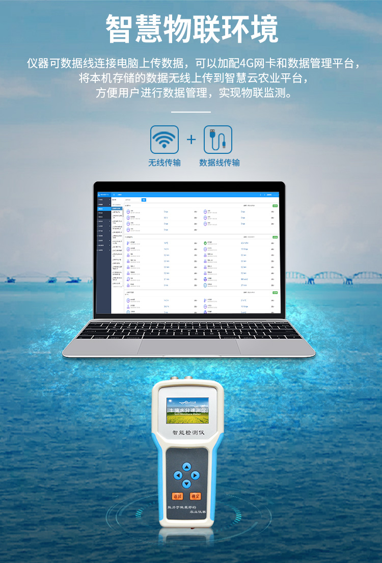1、☆儀器可加配4G聯(lián)網(wǎng)功和能數(shù)據(jù)管理平臺(tái),將本機(jī)存儲(chǔ)的被測(cè)點(diǎn)環(huán)境因子測(cè)量歷史數(shù)據(jù)無(wú)線上傳到智慧云農(nóng)業(yè)平臺(tái),方便用戶進(jìn)行數(shù)據(jù)管理和長(zhǎng)期分析。
