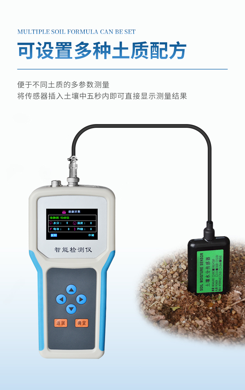 土壤多參數采用一體化結構設計,可快速準確測量土壤中含水量、溫度,可對多處樣地、不同土壤深度的水分含量溫度進行快速檢測和長期連續監測。