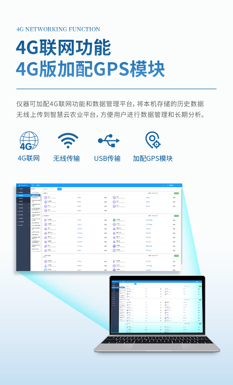 6、儀器配備4G聯網功能數據管理平臺,將本機存儲的被測點環境因子測量歷史數據無線上傳到智慧云農業平臺,方便用戶進行數據管理和長期分析。