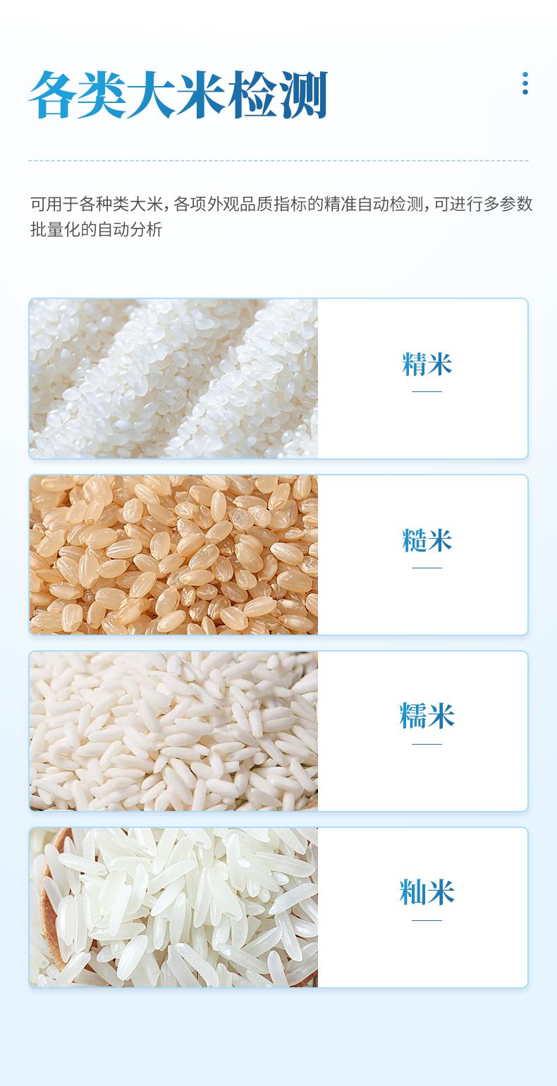 大米外觀品質檢測儀可自動測量每粒的面積、長徑、短徑、長寬比、圓度、等效直徑。可用于各種類大米(精米、糙米、糯米等)各項外觀品質指標的精準自動檢測,可進行多參數、批量化的自動分析