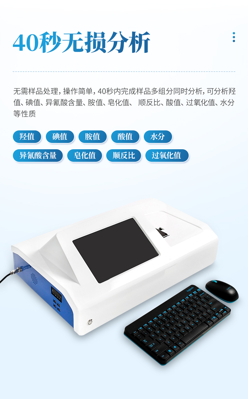 無需樣品處理,操作簡單,快速分析,40秒內(nèi)完成樣品多組分 同時分析,可分析羥值、碘值、異氰酸含量、胺值、皂化值、 順反比、酸值、過氧化值、水分等性質