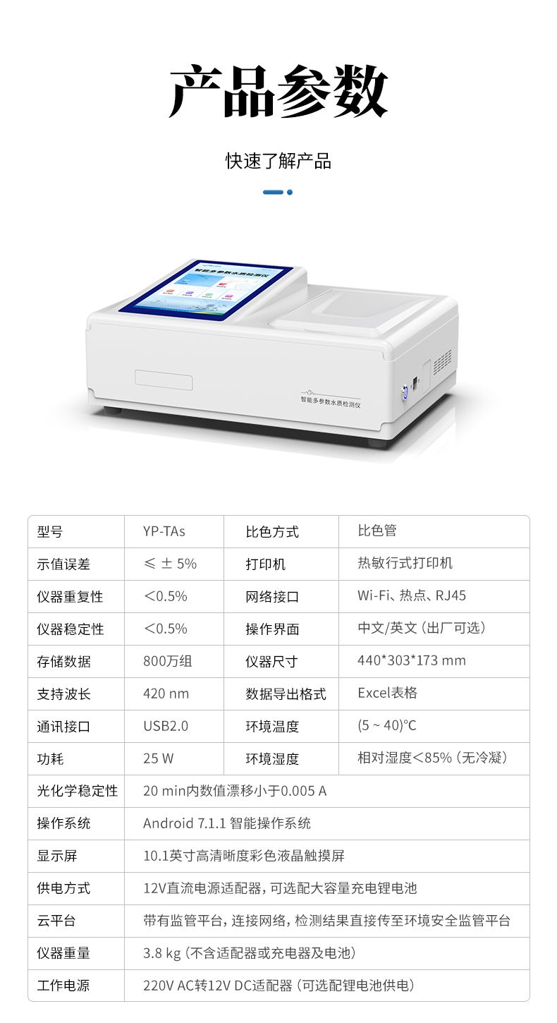 水中砷檢測儀是一款基于分光光度法原理研發的智能化水中總砷檢測儀,專門用于飲用水、地表水、地下水及廢水中總砷的快速定量分析。儀器采用高性能LED光源與大面積光電池,結合優化的硝酸銀-聚乙烯醇吸收顯色體系,確保了在420nm波長下檢測的高靈敏度與穩定性。其搭載的Android智能操作系統與,使操作直觀流暢;具備萬條數據存儲、Wi-Fi/藍牙傳輸及防水機身,非常適合實驗室與現場檢測場景。儀器支持多點標定與內置曲線,配合Type-C通用充電與長續航設計,為用戶提供了準確、便捷、可靠的一體化砷檢測解決方案。