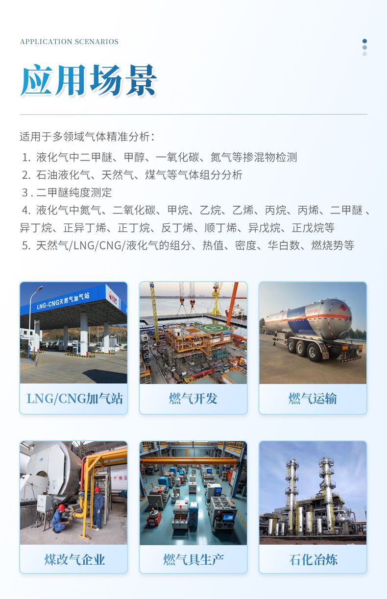 LNG CNG加氣站、油田氣、煤層氣、礦井氣、頁巖氣、燃?xì)夤艿肋\輸公司、燃?xì)膺\輸公司、燃?xì)鈨湔尽⒚焊臍馄髽I(yè)、LNG點供、燃?xì)饩呱a(chǎn)企業(yè)、石油煉化、焦化廠、冶煉廠和供氣站等眾多行業(yè)。