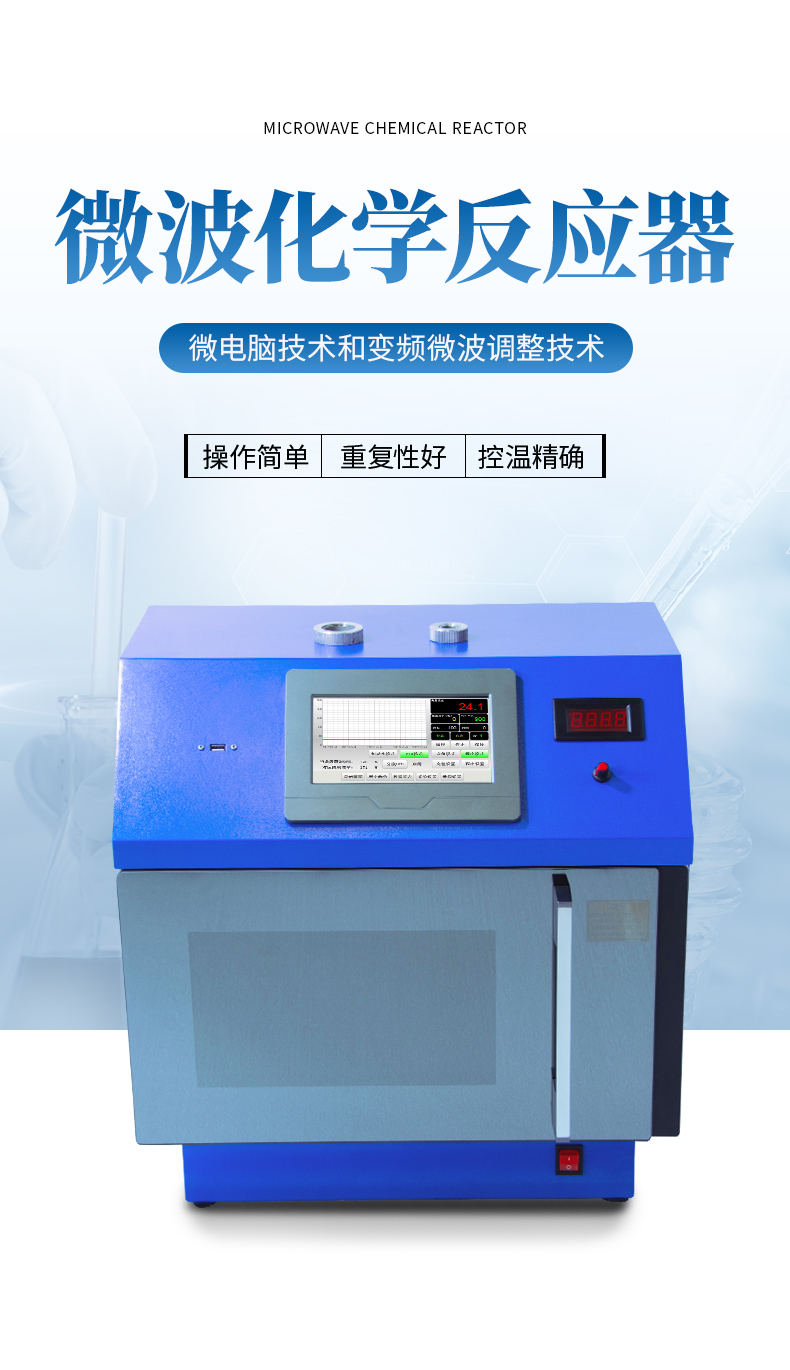微波化學反應器具備:常壓合成反應、微波萃取反應、常壓合成/萃取等多種試驗模式。可以同時設置微波功率和溫度上限,30段程序控溫,超大液晶顯示屏,實時進行溫度和時間設置,對加熱功能有更強的操作空間。用戶可根據反應條件任意加裝標準接口的反應容器(50-500ml),及冷凝回流、滴加、補液和分水等裝置。