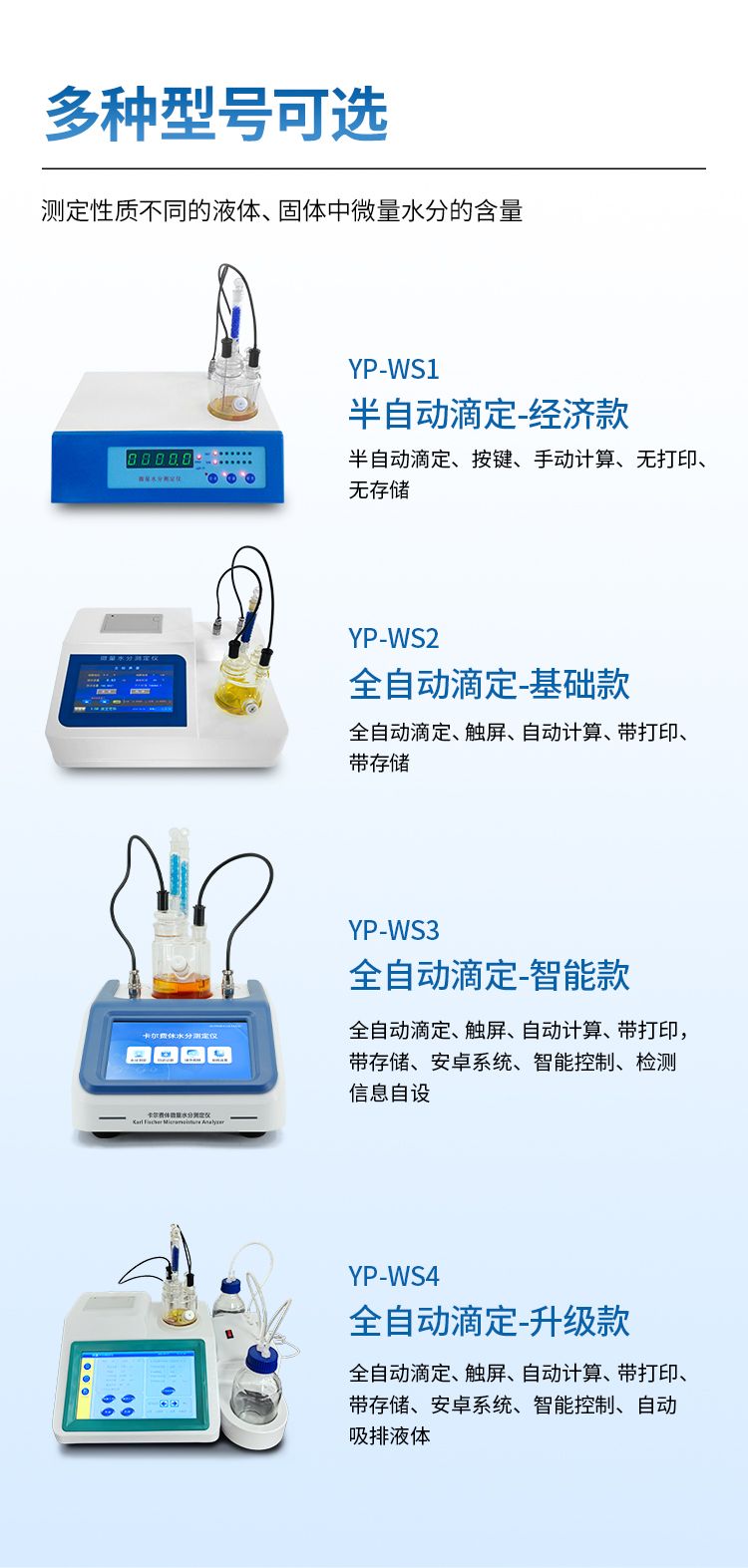 2.儀器具有試驗結果存儲、打印、計算功能;樣品測定過程由儀器自動控制,攪拌、測定60秒左右自動完成,直接顯示測定結果;全密封滴定池瓶,避免試劑與人接觸,也避免環境濕度的影響;儀器中文液晶顯示,并具有自動計算和打印功能,能打印出百分含量、樣品編號、試驗員、實驗日期等內容;儀器準確度為:①水含量小于10微克水時,測量值誤差小于2ug水;②水含量在10微克-1000微克水時,測量誤差≤2ug水;③水含量在1000微克以上時,測量值誤差≤0.2%(不含進樣誤差);